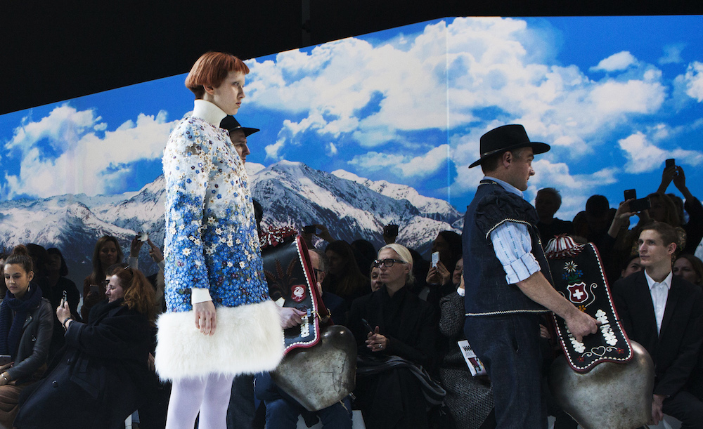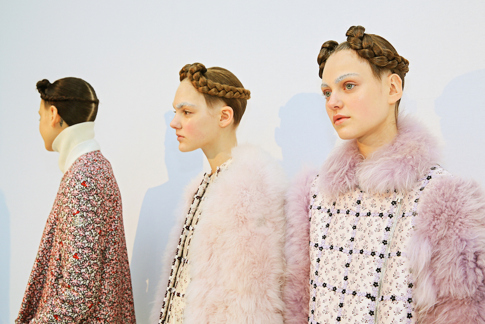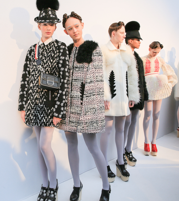 Princess outerwear comes in cozy pales + a medley of blues at Moncler Gamme Rouge fall 2016. The Giambattista Valli sweet touch brings girlie to serious warm gear. Purposeful + textured fabrics mingle artfully with floral + embellished details, keeping the chick parade warm + ready to strike a pose.