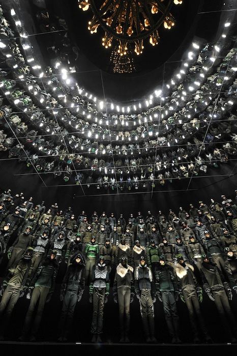 The Autumn/Winter 2013 collection dubbed ‘the Inner Forrest’ featured 370 models in a woodsy arrangement for a full circle view. Columned stacks of men and women donned head to toe outerwear garb as a powerful theatrically light and sound show left quite an enhanced impression. The audience enjoyed the grandiose quality of it all from a darkened pit in the center surrounded by shades of green in varying intensities reminiscent of the mountains from which the brand was born. Check out the video for the full experience we can’t stop talking about.