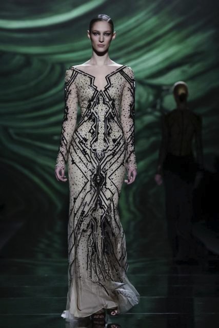 The stylish collection included rich jewel tones such as oxblood and amethyst. The piece that stood out to our eyes was a gorgeous emerald, 1920’s inspired gown with embroidered tulle and a sensual open back. It screamed OSCARS! Besides the beautiful dresses, Monique Lhuillier presented her FW 2013 shoe collection. The striking heels included art deco inspired motifs made with leather, velvet, and satin with her signature lace overlay.