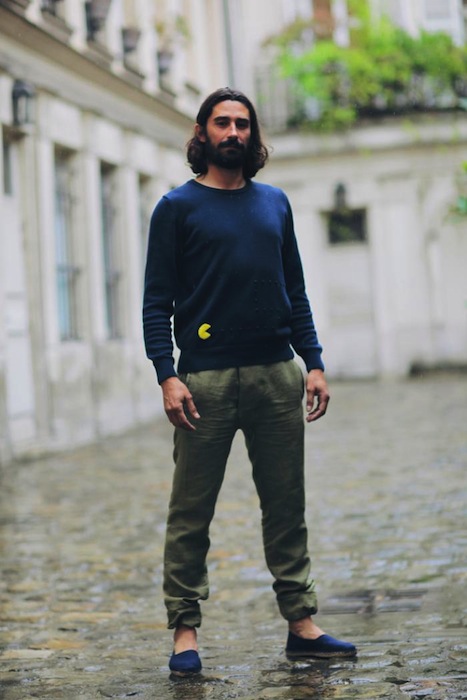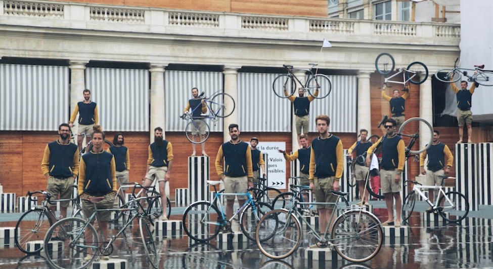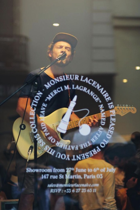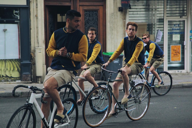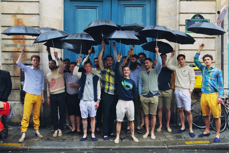 Bringing the spirit of the collection to life, twenty models dressed with the same uniform: a knitted teddy in pima cotton, a pair of shorts jodhpurs, and rope-soled sandals, went across Paris streets by bike on Saturday, June 28 th. Fun! The ride finished the Monsieur Lacenaire store on Charlot’s street for some cheers and Lockart’s private concert. Here’s a view of the frenchies having a little fun. Monsieur Lacenaire spring 2015 menswear commentary by Brigitte Segura.