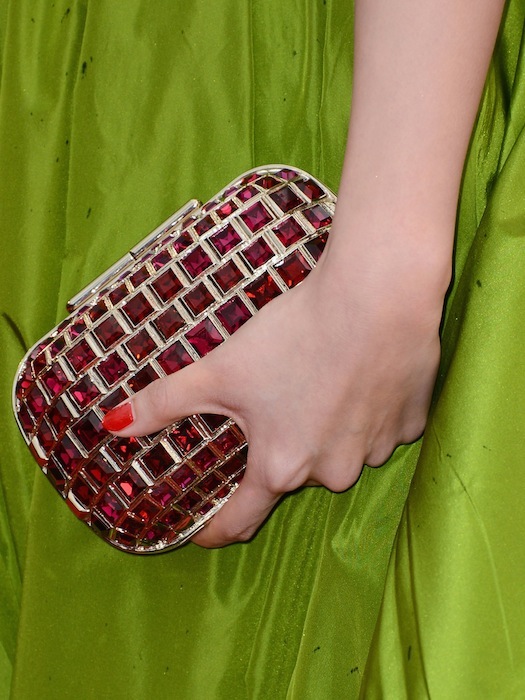 The Fashionable details: bringing back the lace, Cara Delevingne showcased jaw-dropping cinematic glamour in Burberry. While her catwalk counterpart, Georgia May Jagger, was a vixen in a ruby Roberto Cavalli gown. Reigning runway queen Cindy Crawford, brought out the bright whites in her floor skimming Cavalli look. Tobey Maguire, Emma Watson, Zhang Ziyi, Zhang Yuqi, Carey Mulligan, Freida Pinto, Julianne Moore, Florence Welch [pink miu miu bag], Isla Fisher, Steven Spielberg, Ines de la Fressange, Lana Del Rey, Fan Binging, Naomie Harris, Solange Knowles, Cindy Crawford, and Elizabeth Debicki. Check out some of their fantastic bling- even on their bags.