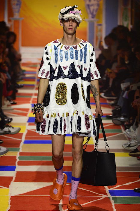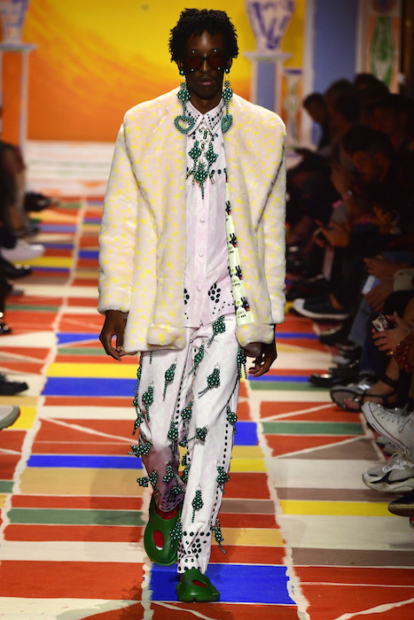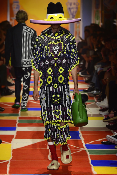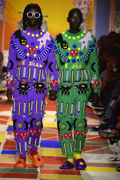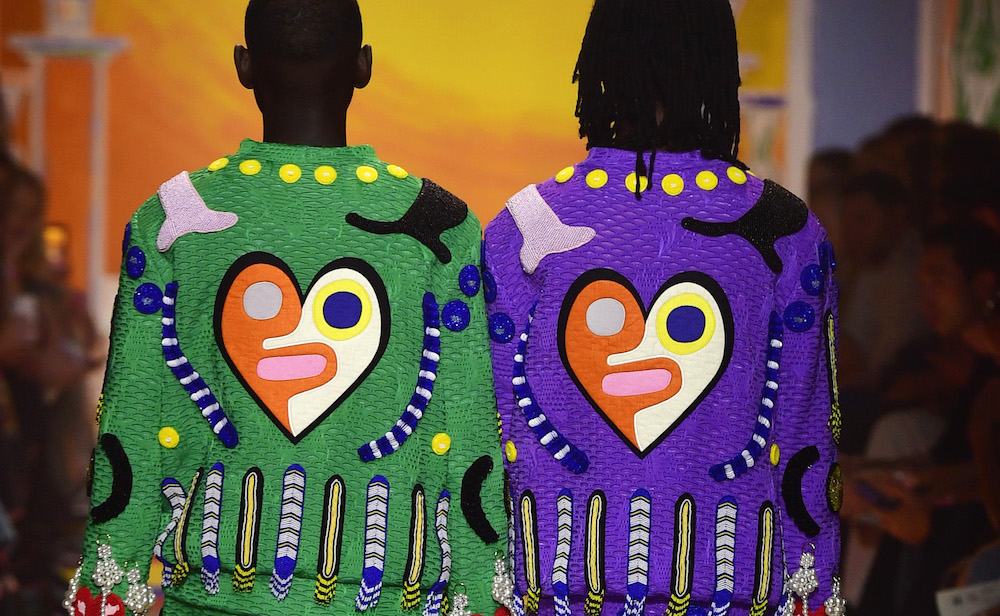 Heart the multicolor vibes! Tom Van Der Borght covers his delightful clothes with symbolic representations of love and humanity, so much so that the models wearing them resemble living totem poles, or members of a futuristic tribe! With a fun-filled aesthetic filled with fun embroideries and beading details, the Belgian Designer fuses joy in every day fashion.
