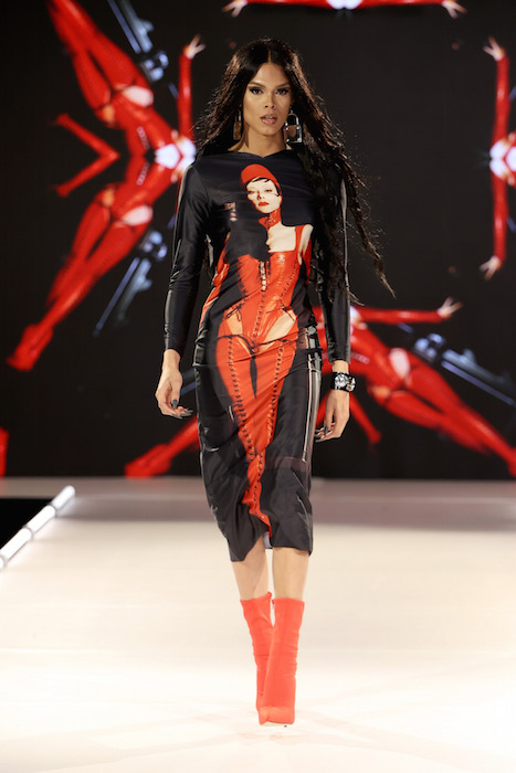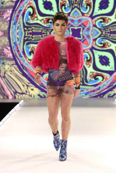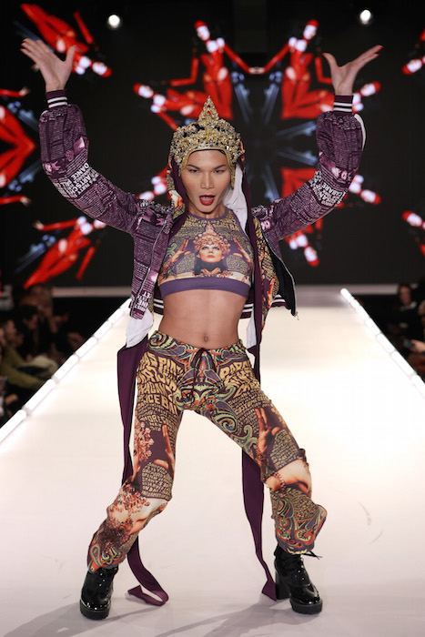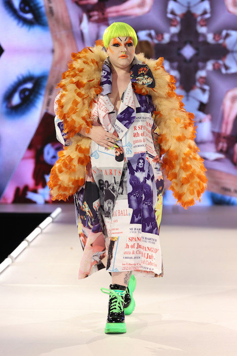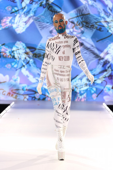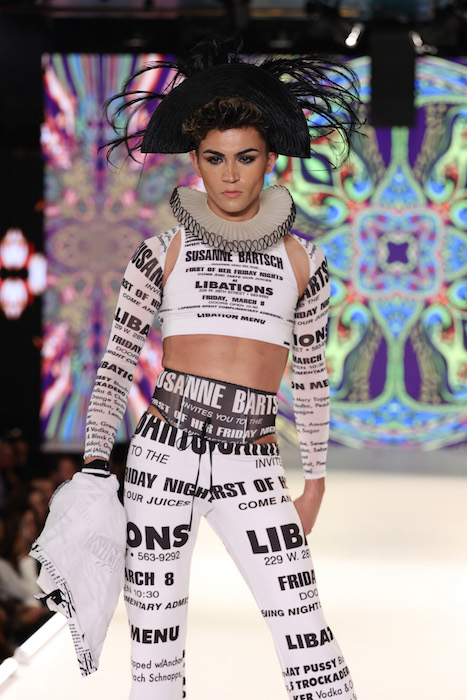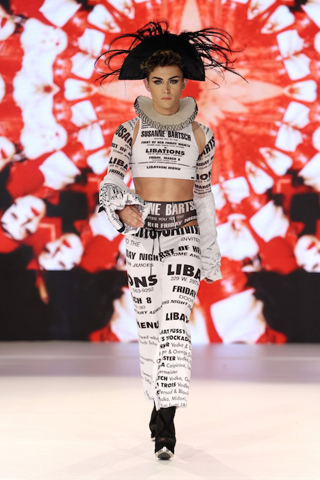 Catching up: Keeping it fabulous ! Queen of NYC nightlife Suzanne Bartsch puts her vibe on the runway with a show to remember. Showering us with fashion printed with Graphic letters, Printed faces and motifs, lots of color, multicolor, and black – of course.