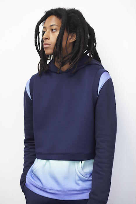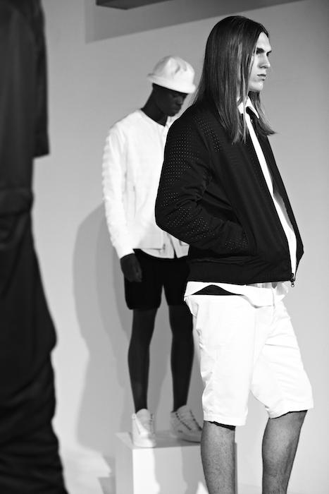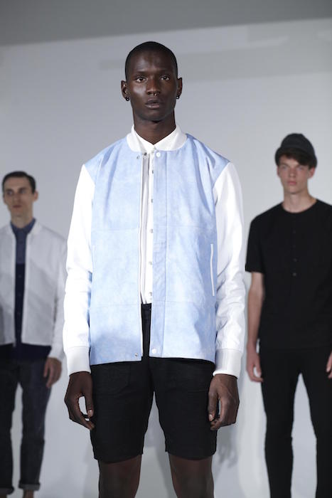 Ruminating on the duality of ‘textured modernism’, Matiere’s presentation dresses a streetwise soul in premium and unexpected fabrics. Realized with dense cotton slub, technical nylon, brushed cashmere, chambray and 3-D striped terry, key looks included modal jersey tees, baseball shirts, gusseted pants, and recast silhouettes for bombers and anoraks. The fashion forward collection strikes an enchanting balance that is hopelessly sleek while asking to be touched.