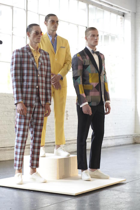 Strongly influenced by the work of the Bauhaus women’s weaving workshops, the custom fabrics for the David Hart presentation were produced by mills in Italy and England. The spirit of the collection undulates with silk printed with colorful geometric shapes, softly tailored tuxedos in iridescent mohair or boldly tinted merino wool as well as suits and pleated shorts in linens dyed in skillfully chosen pastels. It all come together to form an incredibly coherent whole that is daring, but never loud and elegant without ever being stuffy. NYFWM menswear ss16 at NYMD written by Charles Desselle.