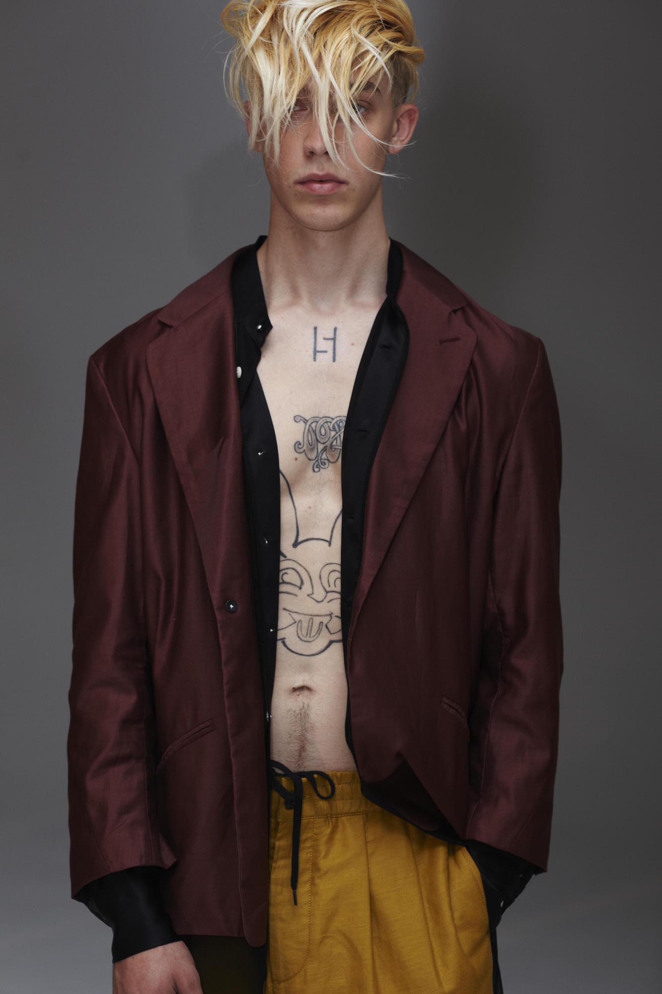 Chapter’s woven tops and bomber jackets follow a square cut and are matched to more tailored drop crotch shorts and cropped pants in signature silhouettes with olive, plum, navy and lavender matched to black. Combined with drop shoulders, raw hemming and three quarter sleeves summer fabrics like linen, rayon and cotton are over dyed or tie-dyed to invoke atmospheric future forward but easy to wear pieces.