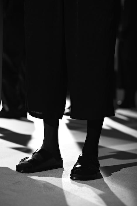 Inspired by Nick Cooper’s photography, the presentation from Fingers Crossed is full of texture, color and a decidedly free spirit—mismatched socks pair with satin belts draped to recall a necktie of sorts. Something of a fantastic cross between urban sportswear and traditional samurai silhouettes, sumptuous fabrics in deep jewel colors were accented by esoteric feeling symbols everywhere.