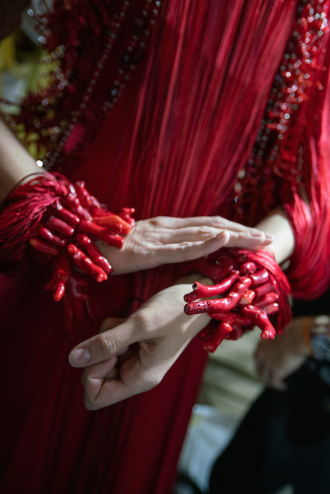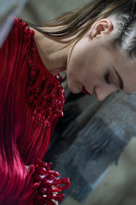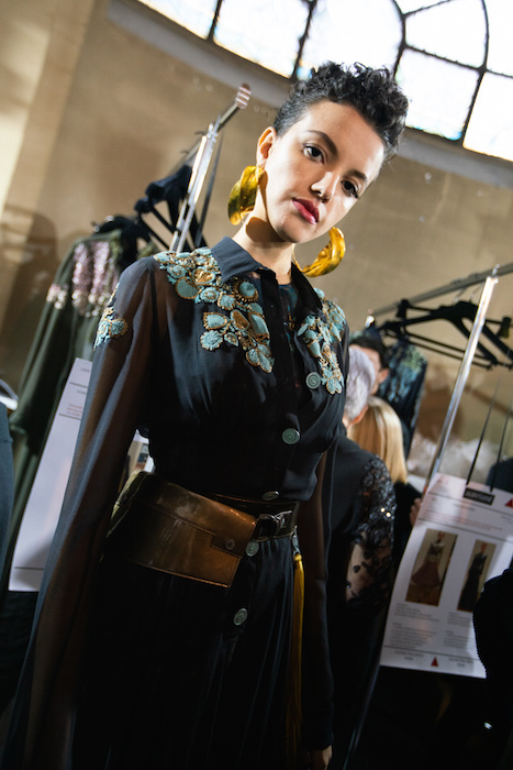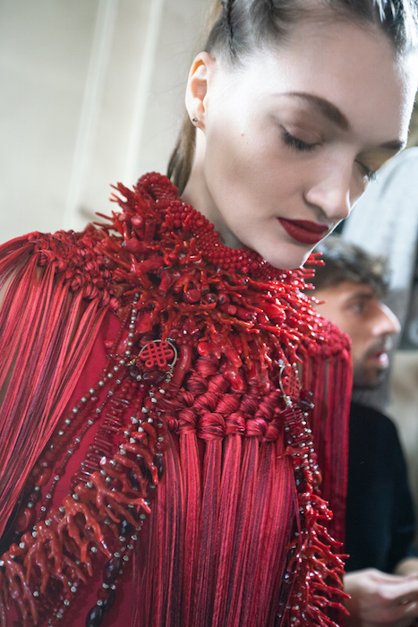 Here’s a stunning view of the runway, and the even more glamourous details of the textural pieces behind the scenes from the uber talented Fournié.