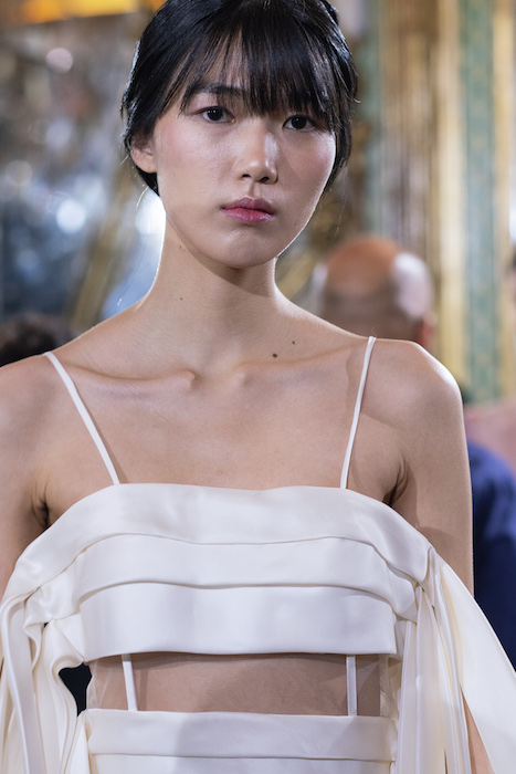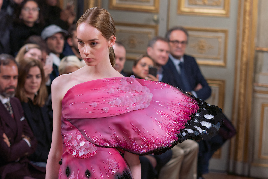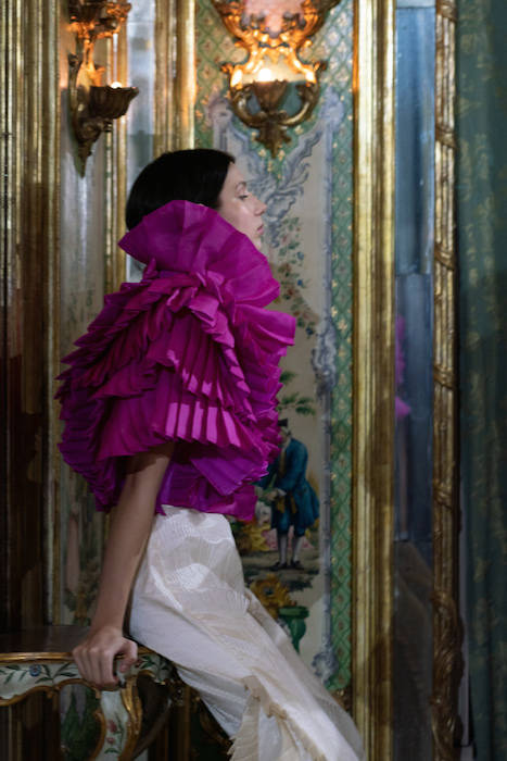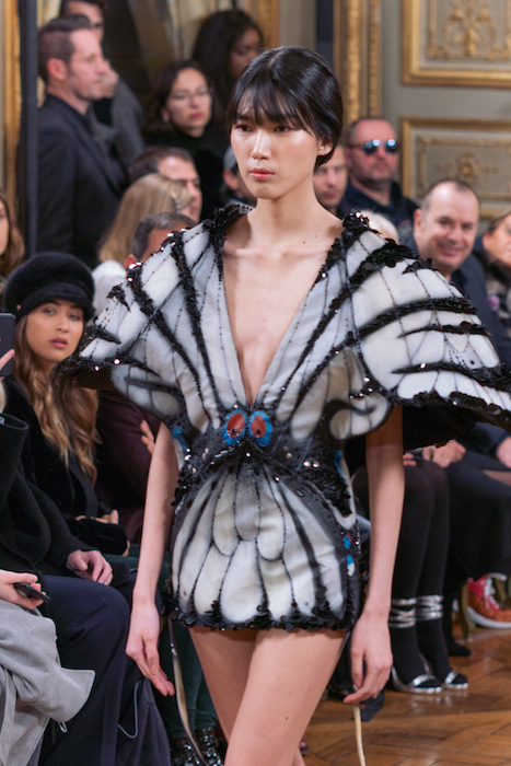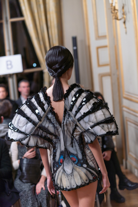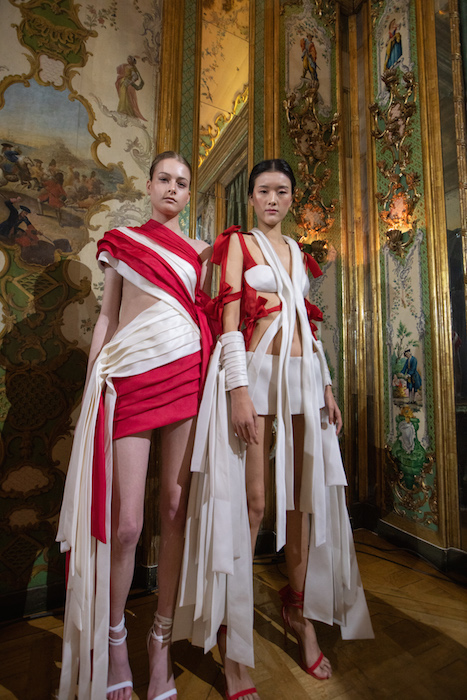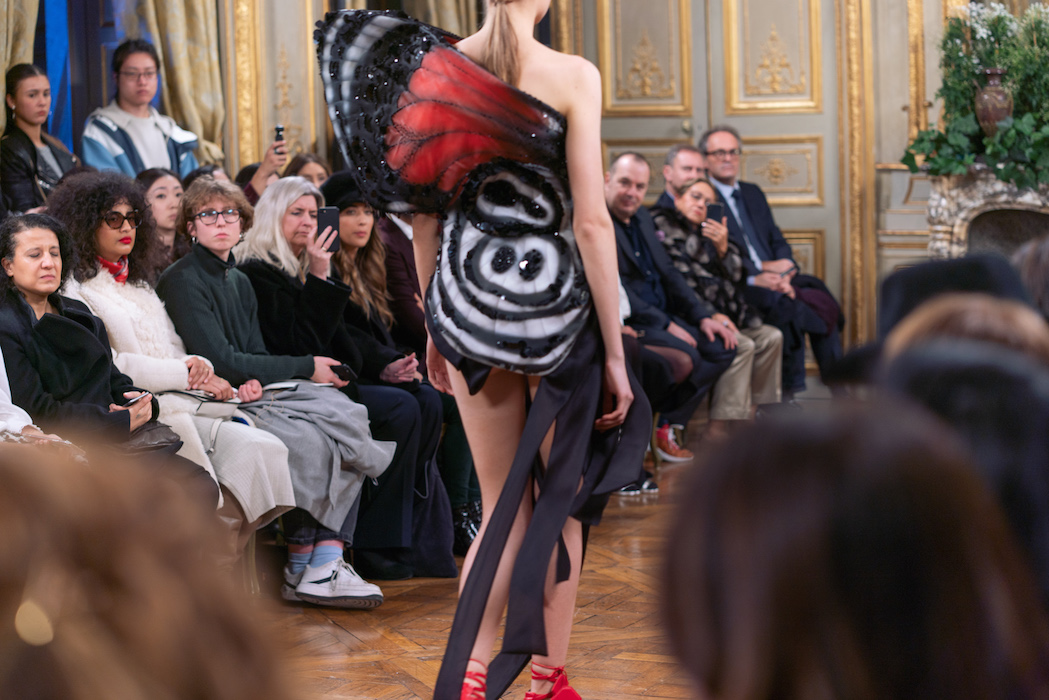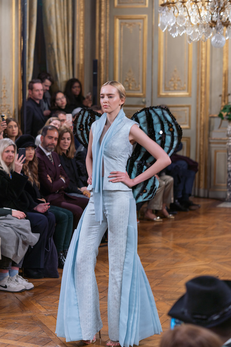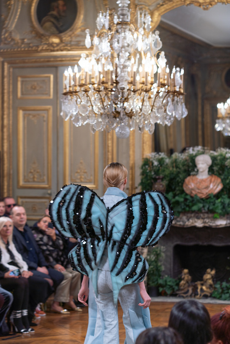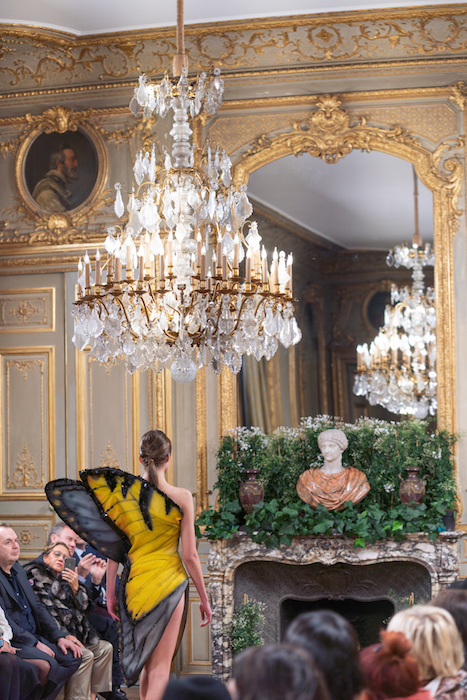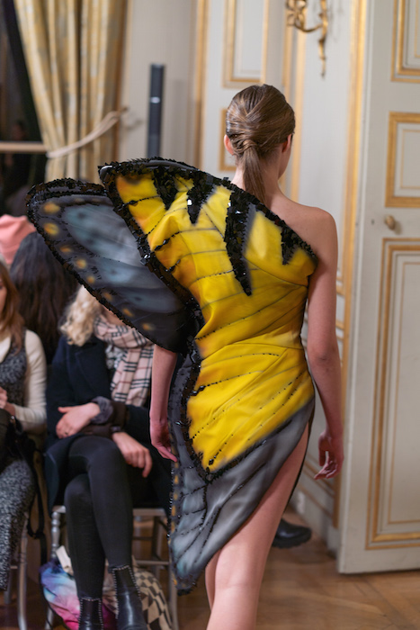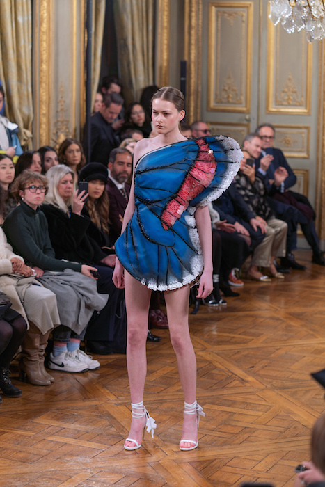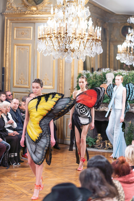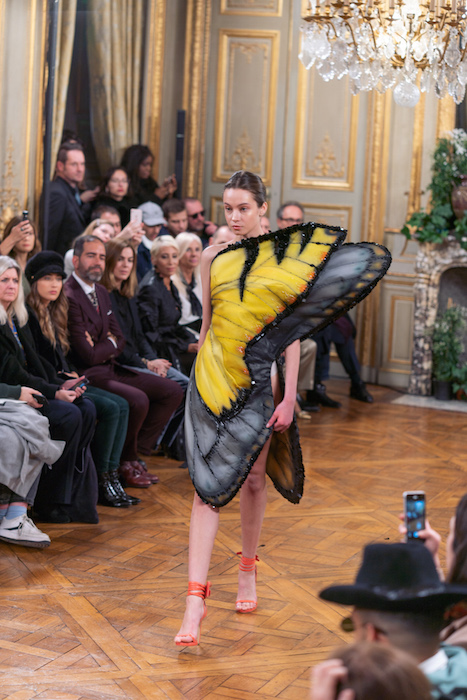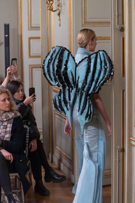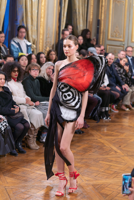 Taking a romantic from menswear, strolling into couture 2020. First up is Farhad Re, who showed his collection at the Italian Embassy in Paris during Paris Couture Week. Here’s a view of the exquisite venue with the gilded decor and chandeliers enhancing the view of the sculptural butterfly inspired cocktail dresses and red carpet ready gowns.