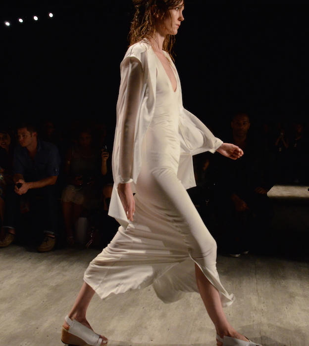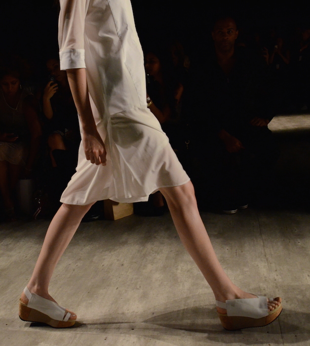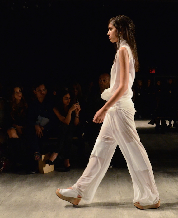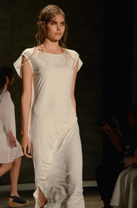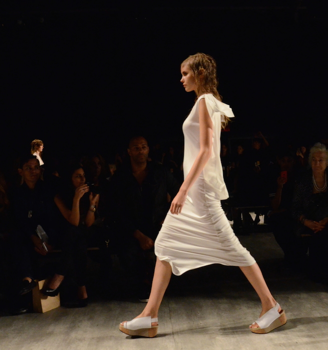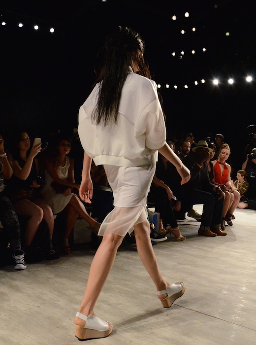 Impeccable cuts and slants aren’t new to the minimalistic ss15 collection that is Demi Park’s Parkchoonmoo shown at MBFW during NYFW. This collection evolves in pragmatic shades of white, black, and beige. The involvement of sheer and light to heavy leather form somewhat of a timeless elegance. While the draped cuts and angles make every piece incredibly different and modern.