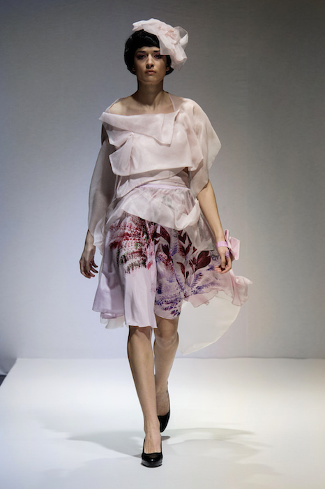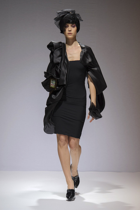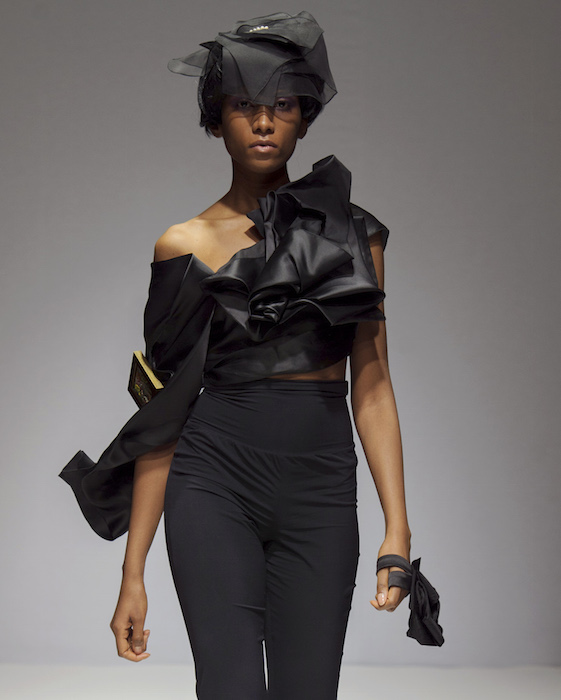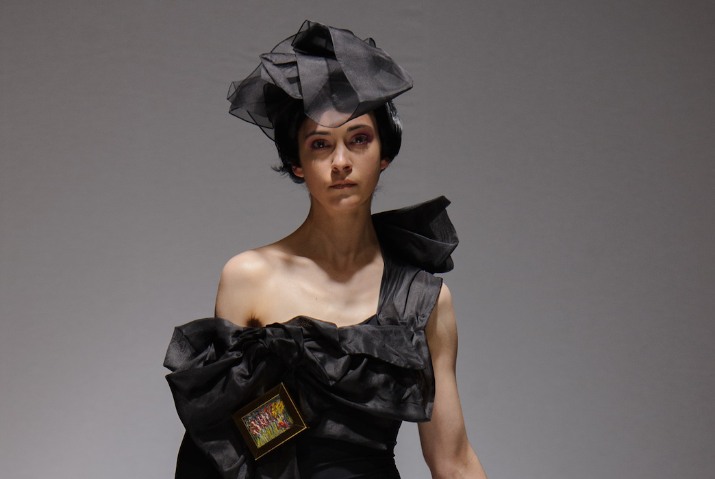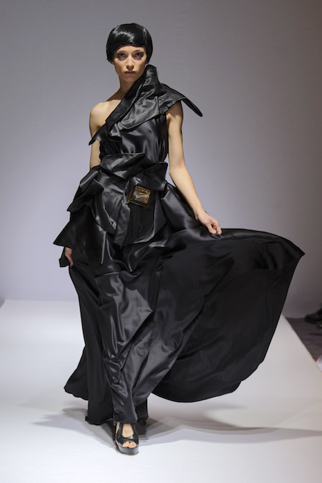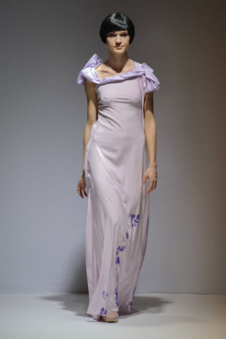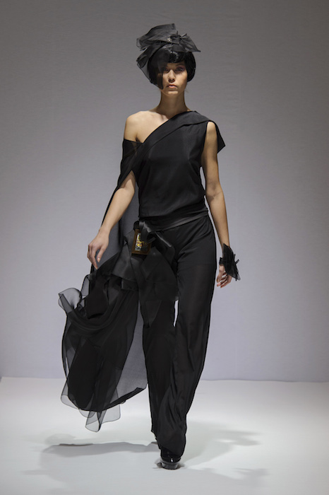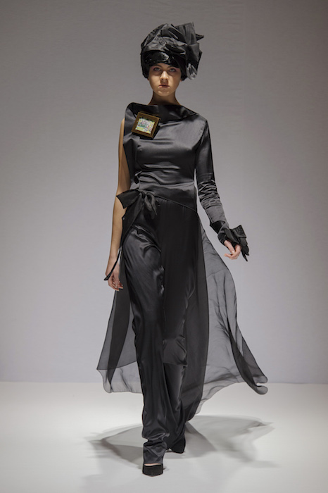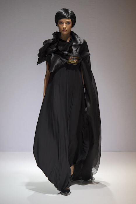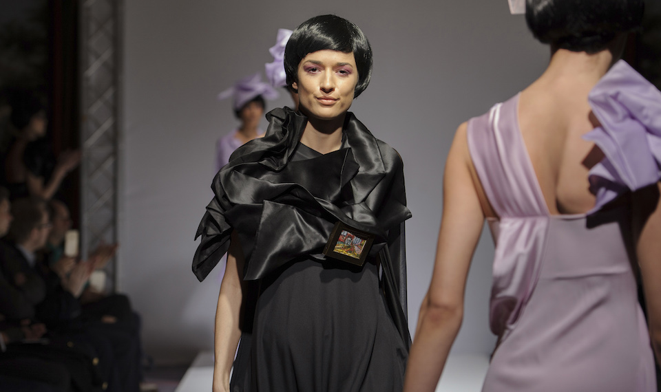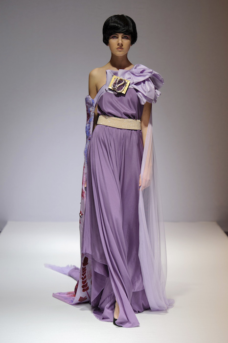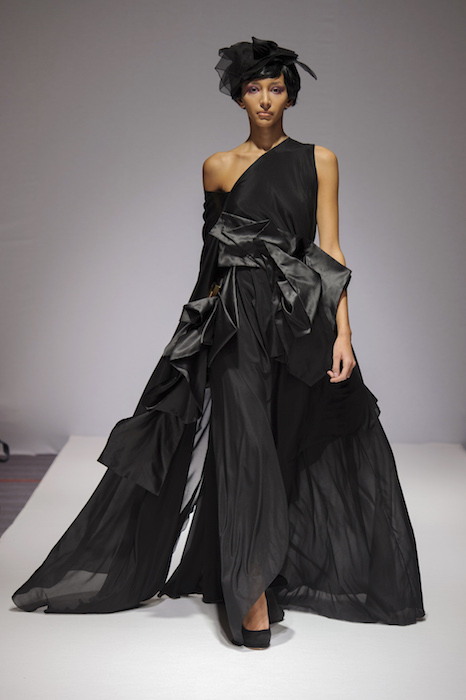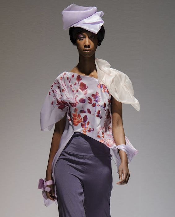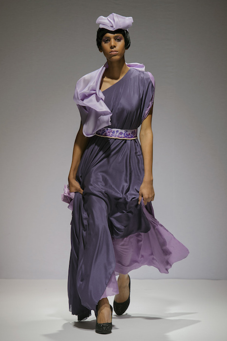 PATUNA: A lady in black, a lady in lavender. Dark feminine meets flowy, drapy, and mysterious. Inspired by Monet’s Art, the collection shown during Paris Couture Fashion Week consists primarily of hand painted silk and organza incorporating shapes and looks that “flow like the Seine and Giverny Pond.”