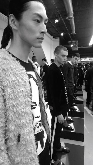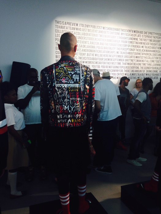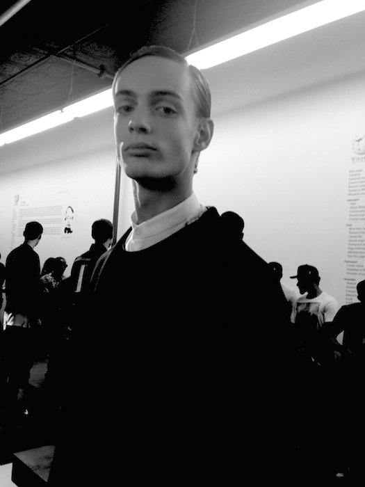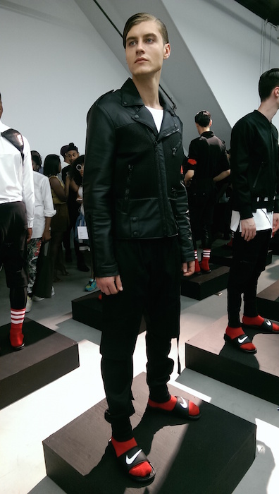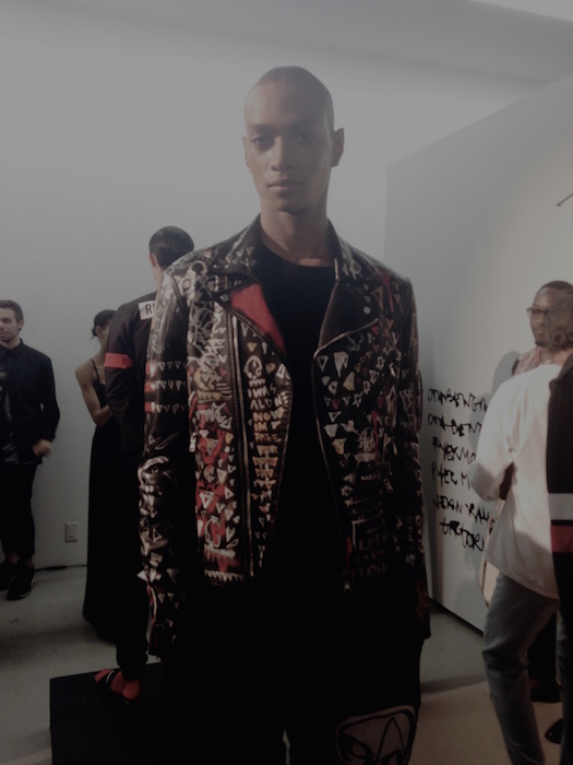 A cool hit with a motorcycle jacket decked out in sketchy art with rock-n-roll flavor. A surprising textured feature revealed a more natural looking dimension against the stark lines and solid selections. Athletic socks and flops removed the bleak nature of the topic and replaced it with a realistically modern touch. Fave faces included Charlie James and Mac Phiri. fdmLOVES Pyer Moss SS16, selects and commentary by Brigitte Segura, written by Sarah A. Freiseis.