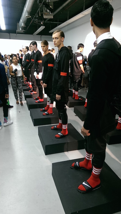 Built to last fashions at Pyer Moss SS16 transformed industrial activewear for men. Designer Jean-Raymond created an edgy collection that memorialized a human sideshow and quite literally translated the message regarding life in captivity. From buckles and straps to holsters and knee pads, the restrictive qualities added intrigue to the conversation.