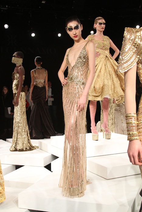 A dreamy visionary of contemporary couture, Rafael Cennamo combined Ancient Egyptian roots with an avant-gardian essence to create an exceptional Fall/Winter 2013-2014 collection shown at Mercedes-Benz Fashion Week. This collection was one that truly made us feel as we were walking into a mirrored closet in Cleopatra’s tomb. The antiqued Egyptian influence oozed off of the gold-dipped ensembles ever so eloquently.