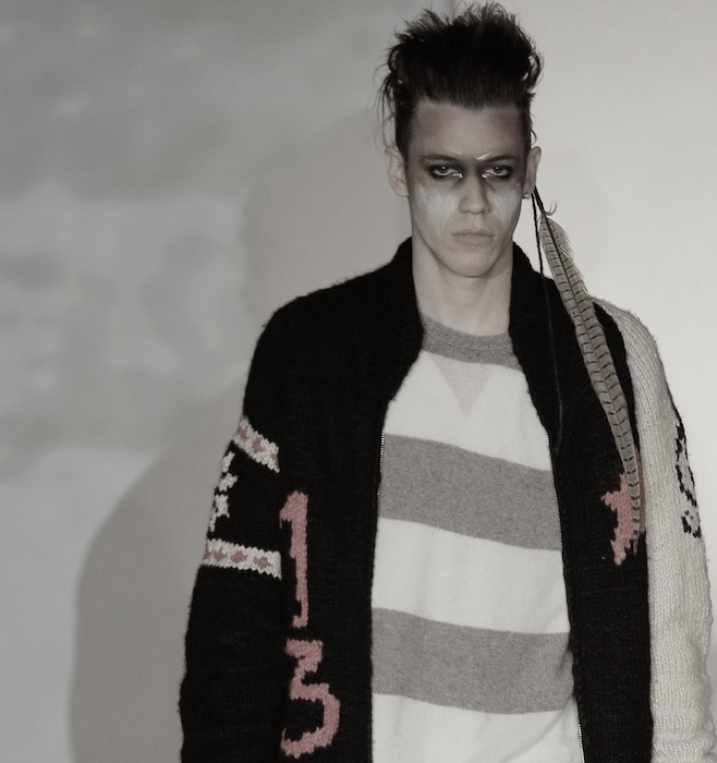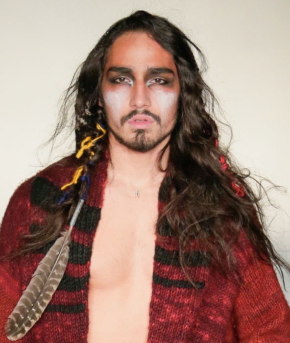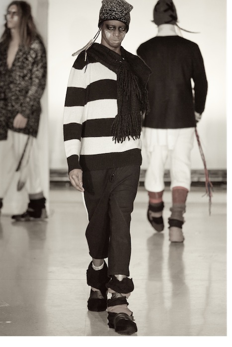 Accessorized with nomadic necessities including hats, scarves, gloves, leg and arm warmers plus head feathers for show, the lost boy look was a story of cool on the go. Artist Jon Hennessey did the hair & make-up, Ian Astbury of The Cult created original music just for the show, and shoes in varying styles were provided by Cole Haan.