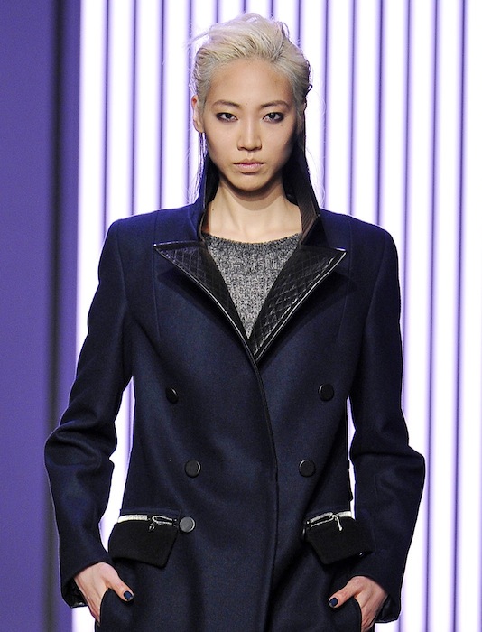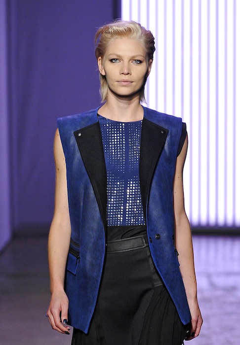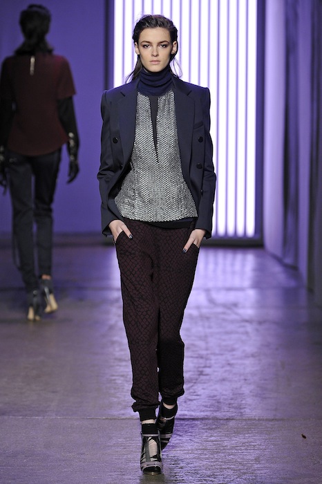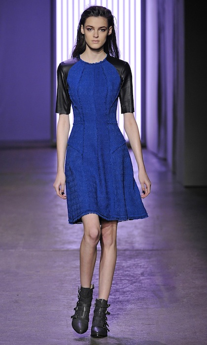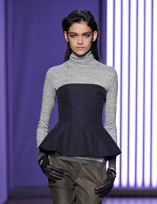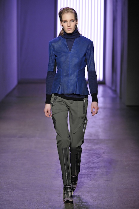 The looks consisted of leather enveloped pencil skirts, kilts and biker jackets, all structurally and stylistically distinctive from the flowy collections she has created past seasons. Taylor took a “Lloyd Wright” approach this season, which called for the immaculate structuring of her peplum-tops, tailored jackets and coats, and symmetrical lining of her trousers and denim. She incorporated the “Brit-Punk” look though various frocks, as she dressed and lined her collection with grey/black nuanced tweed and black-leather trim. Her punk-palette didn’t break rebel tradition and stood within the lines of traditional royal blue, riot red, combat black, and added splashes of mauve, olive, and grey.