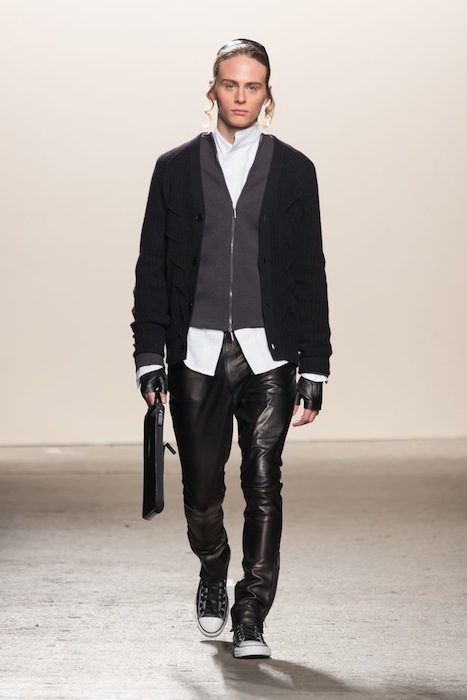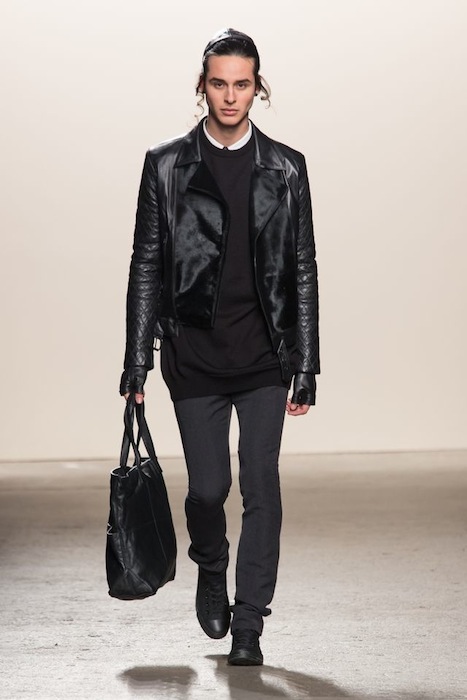 You can clearly see the influence on the models rocking Kippah-inspired leather caps with adjustable straps to go with the payos. Ricardo is no stranger to underlining androgyny, with a huge play on proportions and relaxed fits – he creates versatility for mass appeal without losing his edge. Long-waisted coats with over-exaggerated moto inspired lapels were layered over high neckline long silhouette shirts and slouchy chill cardis coupled with fingerless biker gloves – beaming cool rockability. Oversized biker jackets had interesting snakeskin and quilted textures paired up with skinny leather and wool pants with ankle-zip details- and very must-have pieces for the wardrobe.