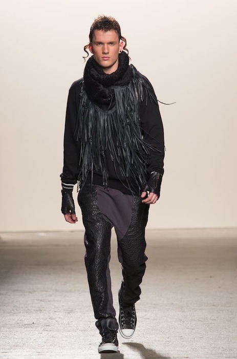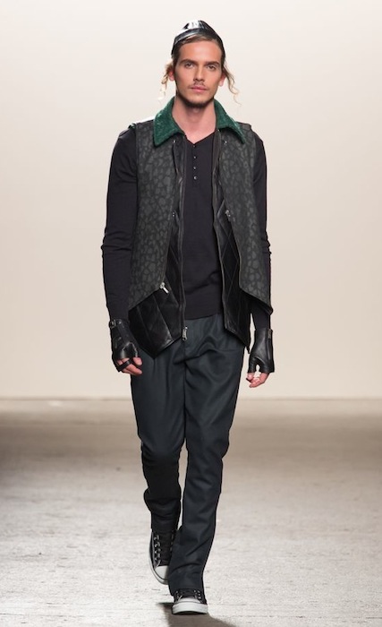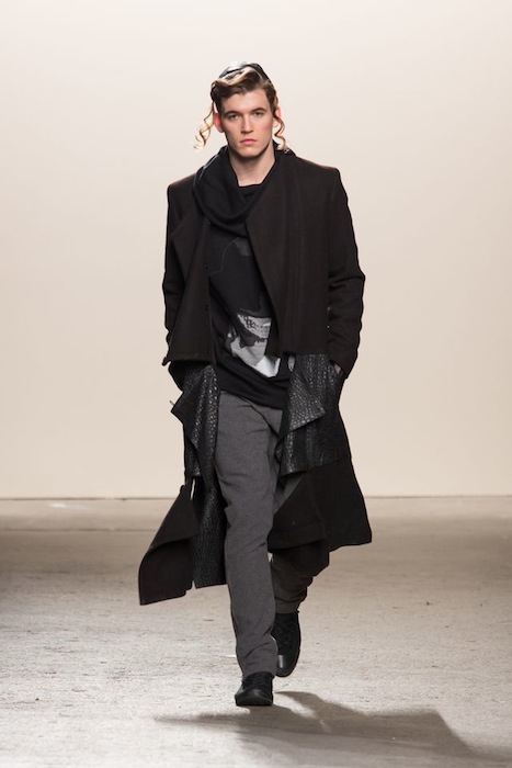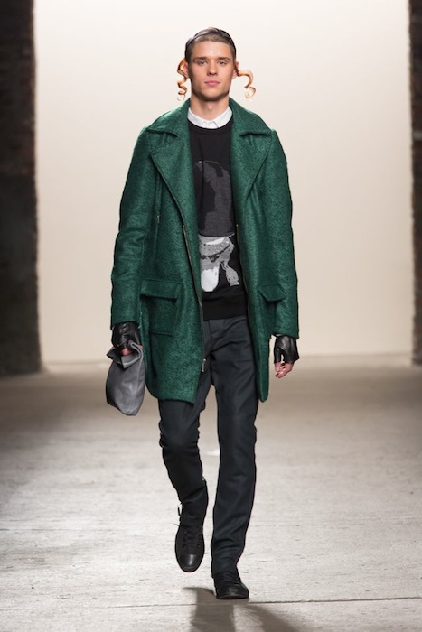 Now who said a kippah wouldn’t be the next hot item in fashion?! Ha, not Ricardo Seco! with his “ALIVE” fall 2013 menswear collection shown at the Eyebeam Studios in Chelsea during NYFW. Ricardo created an authentic harmony of the most two divided zones of Williamsburg, BK– conjuring up cultural identifiers with piercing cool guy hipster liberation. Seco tells FashionDailyMag,