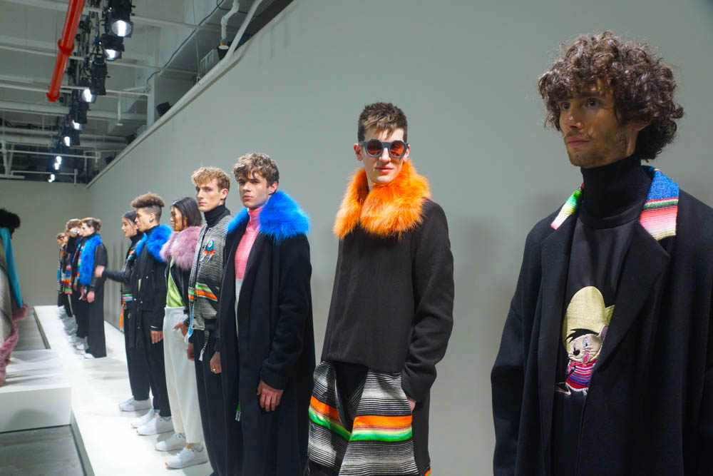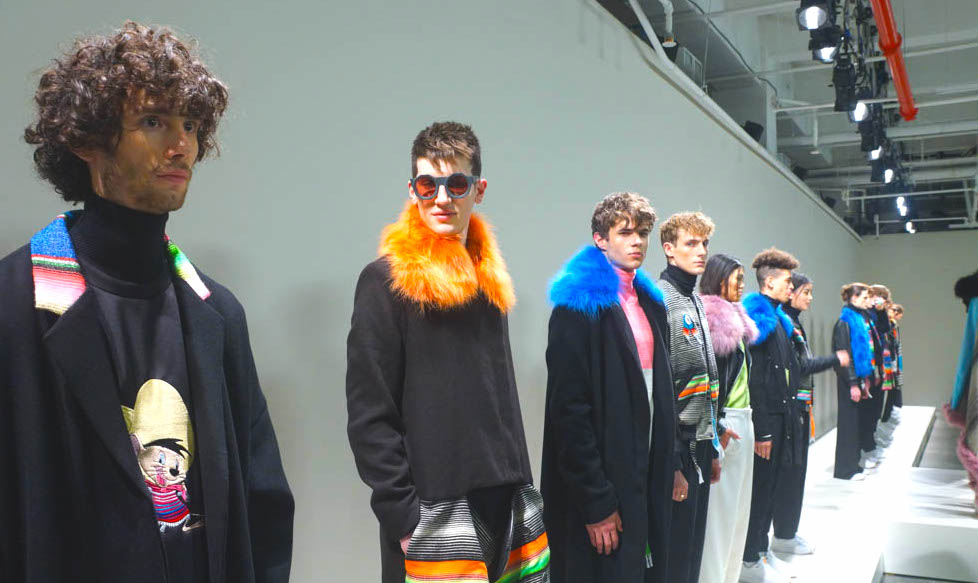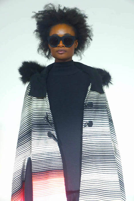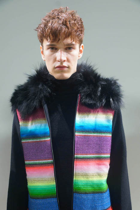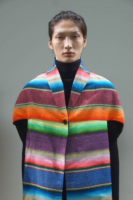 RS: Six months ago I was inspired by the Serape made in the north of Mexico. They have 450 years using this item. I imagined how you can use it in New York in the winter, Burning Man too. I designed using full color with the black and white stripes. I mixed with the other details like fur and black, and to me that represents New York. Mexico dress bought to the streets of New York.