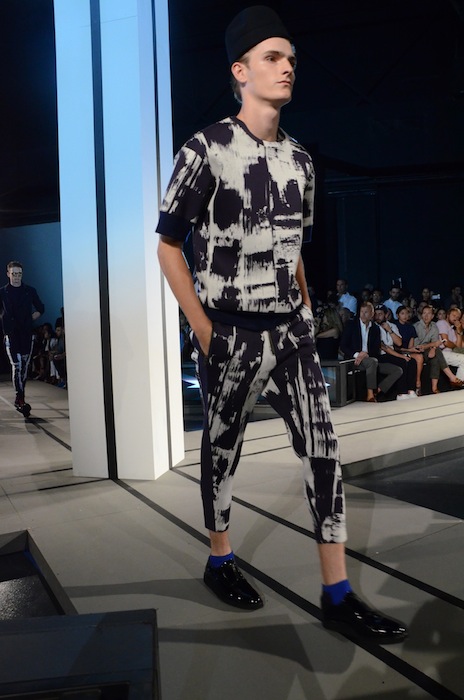 A sophisticated stride in classics adjusted for fit, tastefully tailored elements added interest with hems that hit mid-calf and just below the knee. Minimalist pieces were layered with equally pared down wardrobe staples. On the flip side, a number of sporty looks filled out the assortment of cool, to include sweatshirt material, zippered highlights and more lounge-like moments with draped drawers and tunic length tops. The tonal coloring from head to toe lent a seriousness to the statement, while paint brushed prints added playful pops. A mix of fascinating fabrications and smart detailing made for ensembles with an imaginative appeal. fdmLOVES Robert Geller ss15 selects by Brigitte Segura, written by Sarah Freiseis.