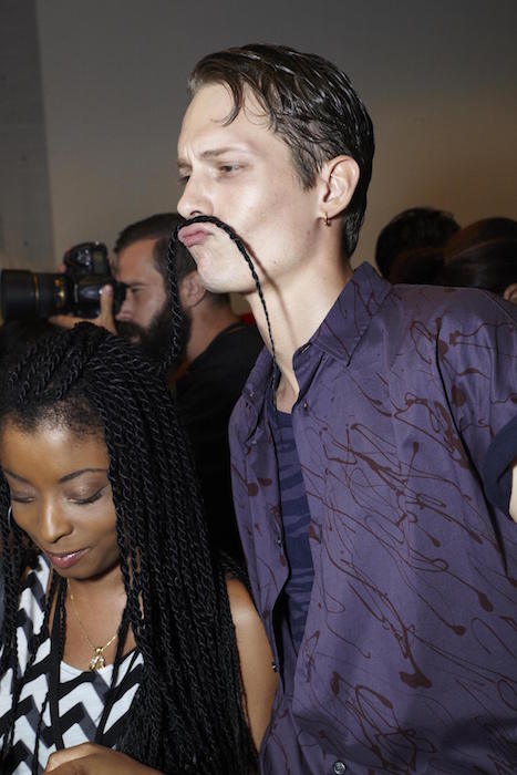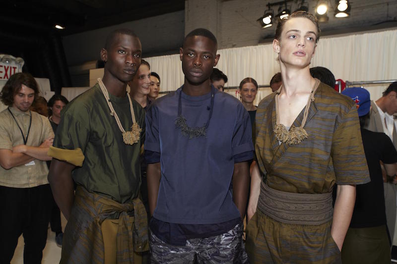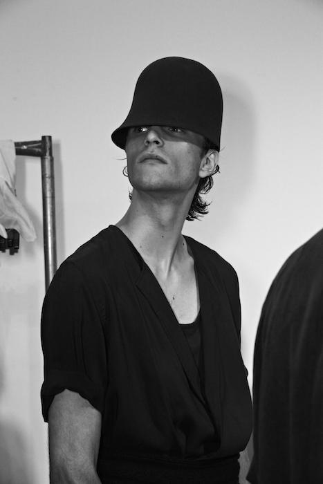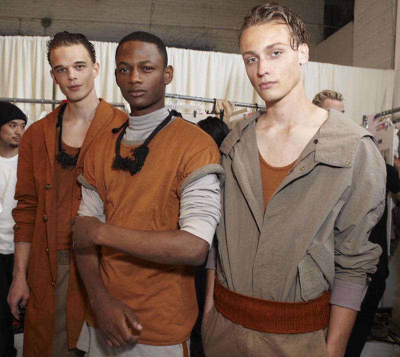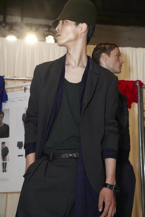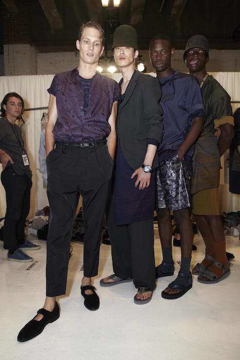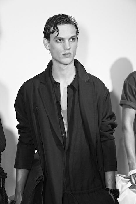 The German designer drew inspiration from his memories of the North Sea add a slightly nautical feel to his collection. Draped drawers and loose shirts were topped with wide belts, necklaces, or hats. Dusty blues among other shades of earthy hues were comfortably artsy in combos in patterned colorways. Backstage in the Geller tradition, we caught up with models including regulars like Felix Gesnouin, Andre Bona + a group of new faves including Charlie James, cristino Lucas, Mac Phiri and Adonis Bosso, all happily sporting the comfortable + edgy modern vibe of the collection.