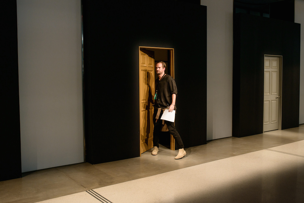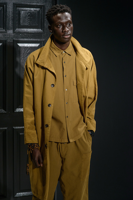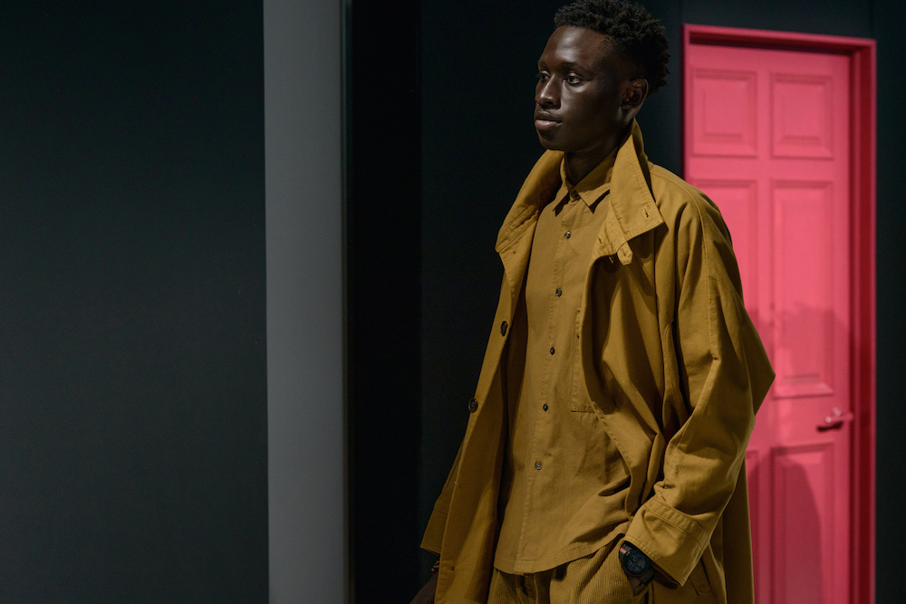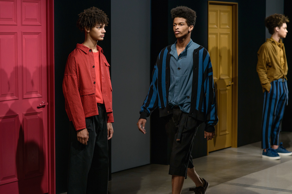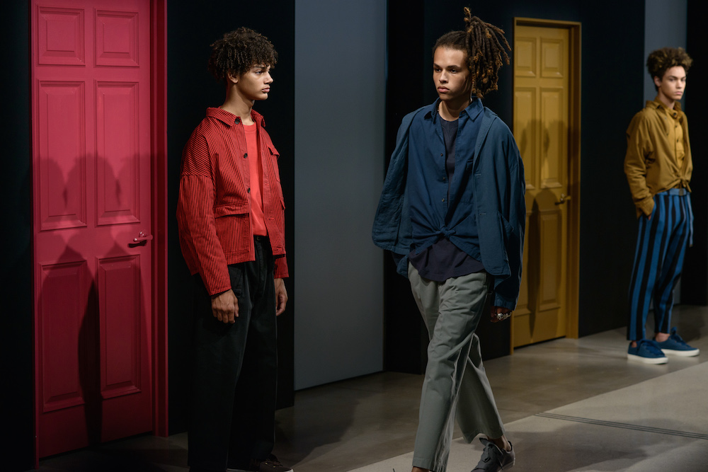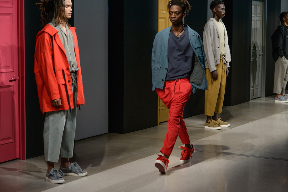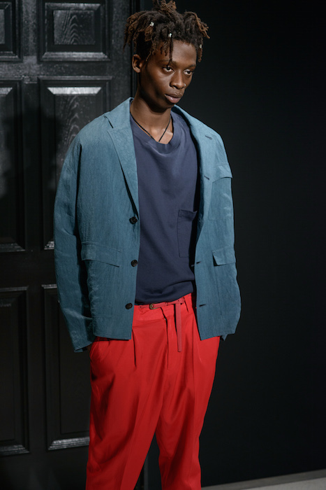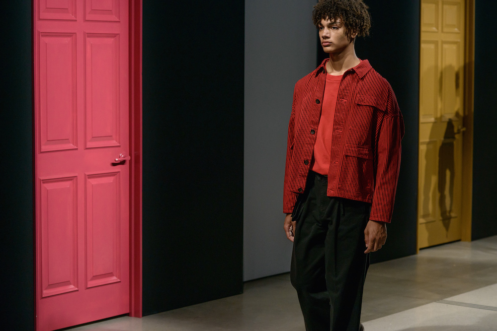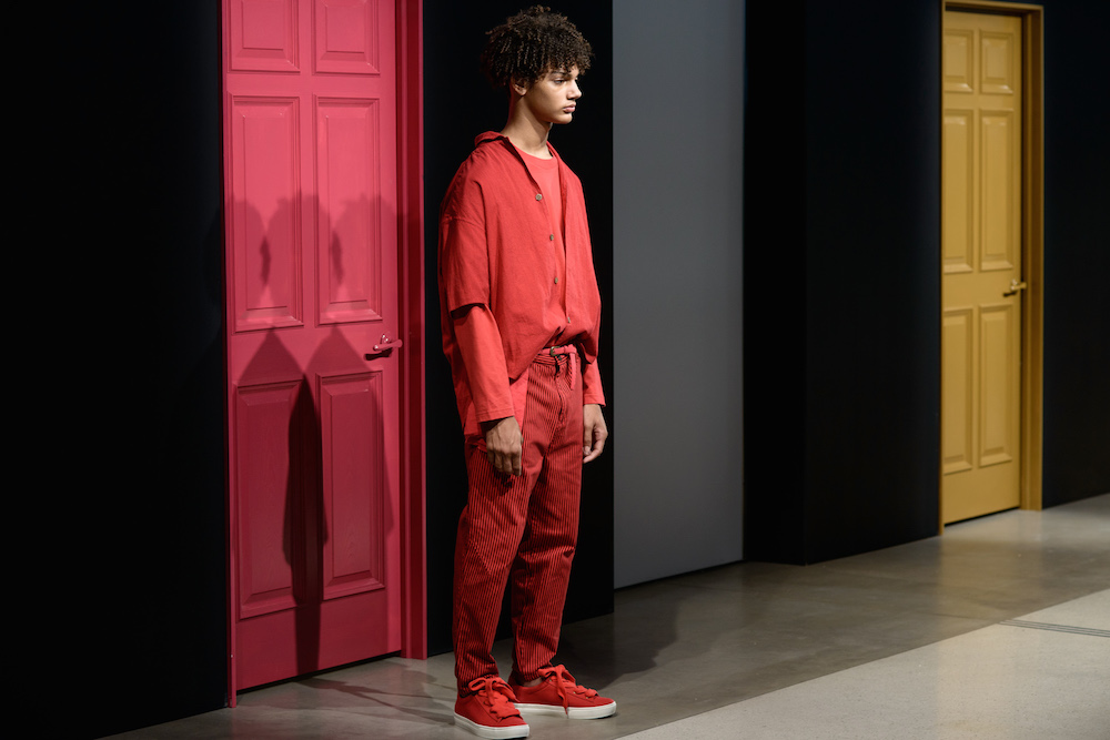 The smart casual fluid summer pieces were presented in a muted rainbow of indigo x a perfect match up of tomato red x a euro-yellow. A brilliantly designed creative set enhanced Geller’s vision with mood-enhancing tones surrounding the catwalk at Cadillac House.