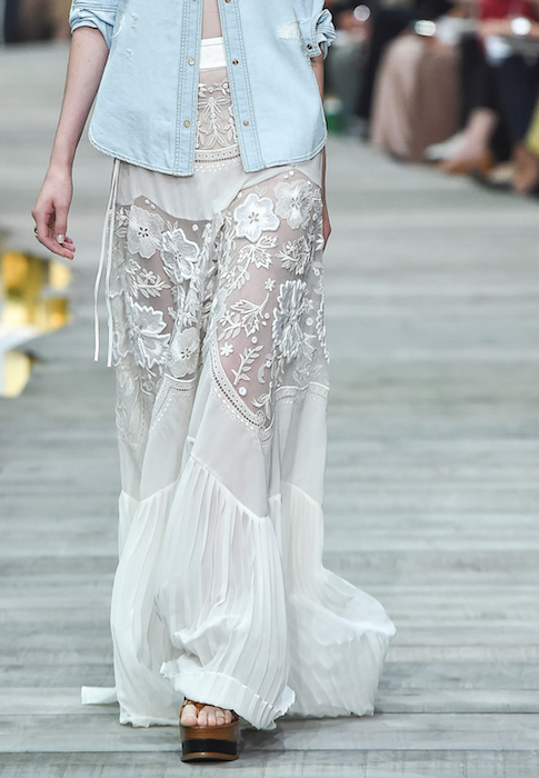 The Florentine designer adds psychedelic floral prints on silk georgette with ribbons fluttering lightly on the long dresses.
