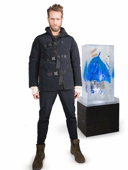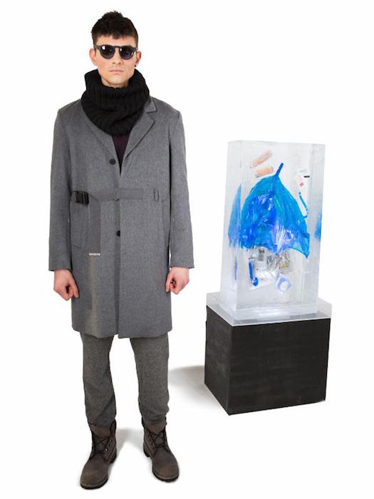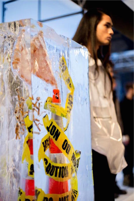 Three gigantic ice-like sculptures were filled with paraphernalia one would find iconic to the streets of NYC. Used metrocards, old pizza, cigarette butts, I love NYC plastic bags, and even a 90s telephone booth were included in the mix. The sculptures were placed in a triangular arrangement within a graffiti street scene surrounding the standing presentation.