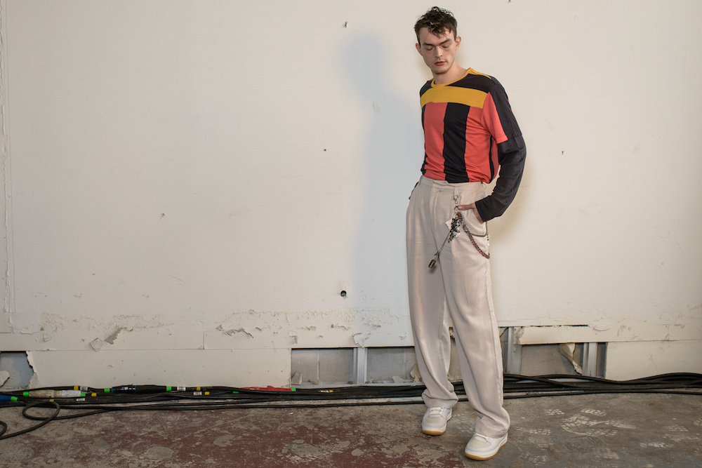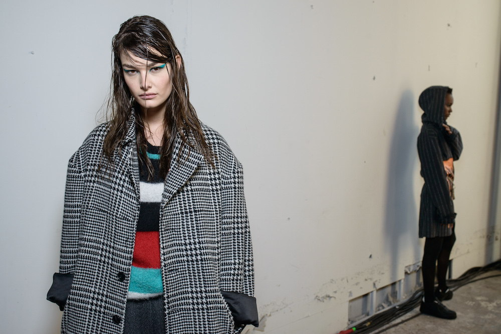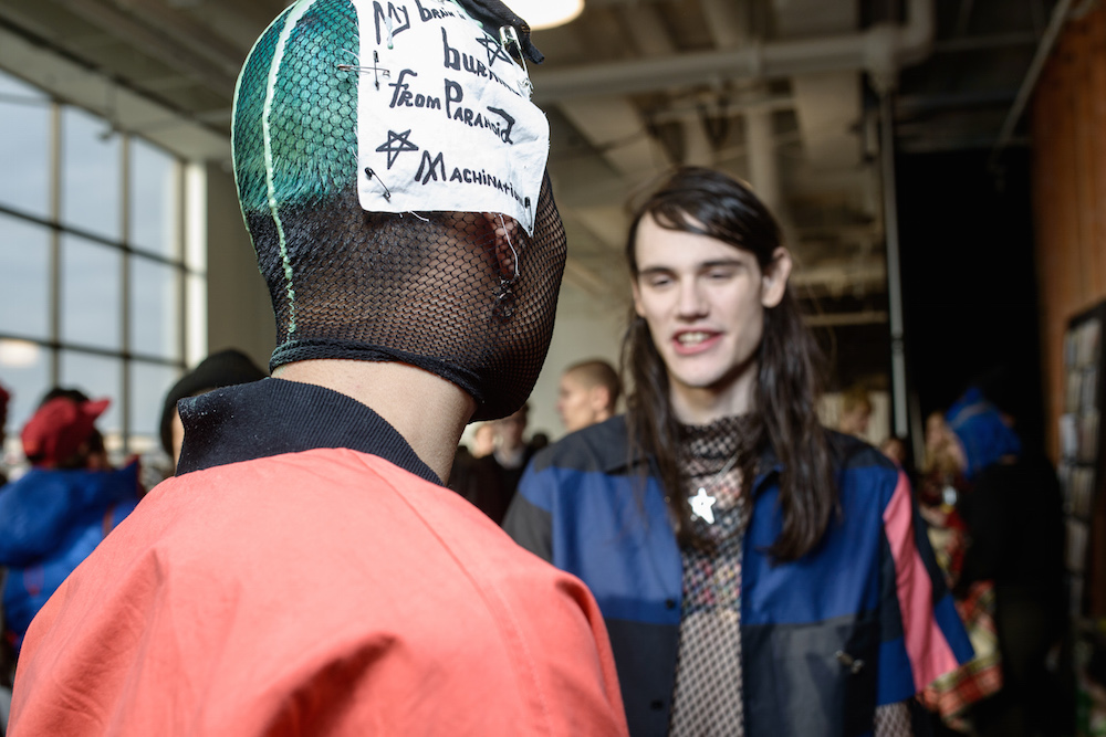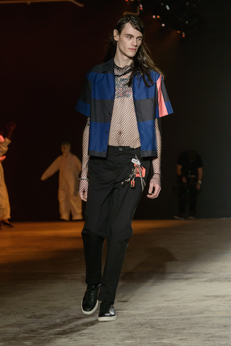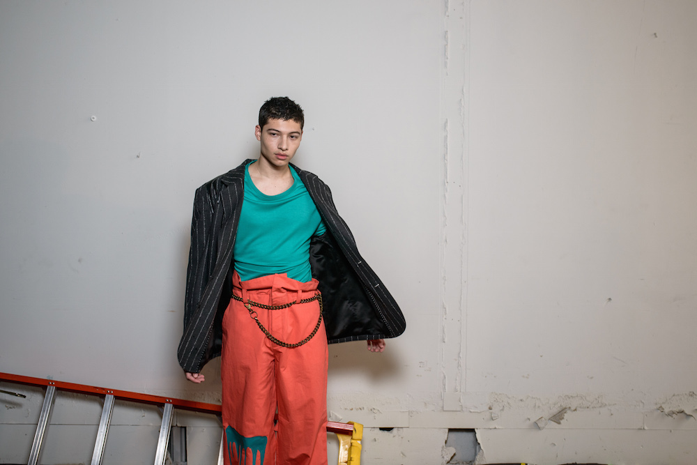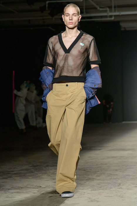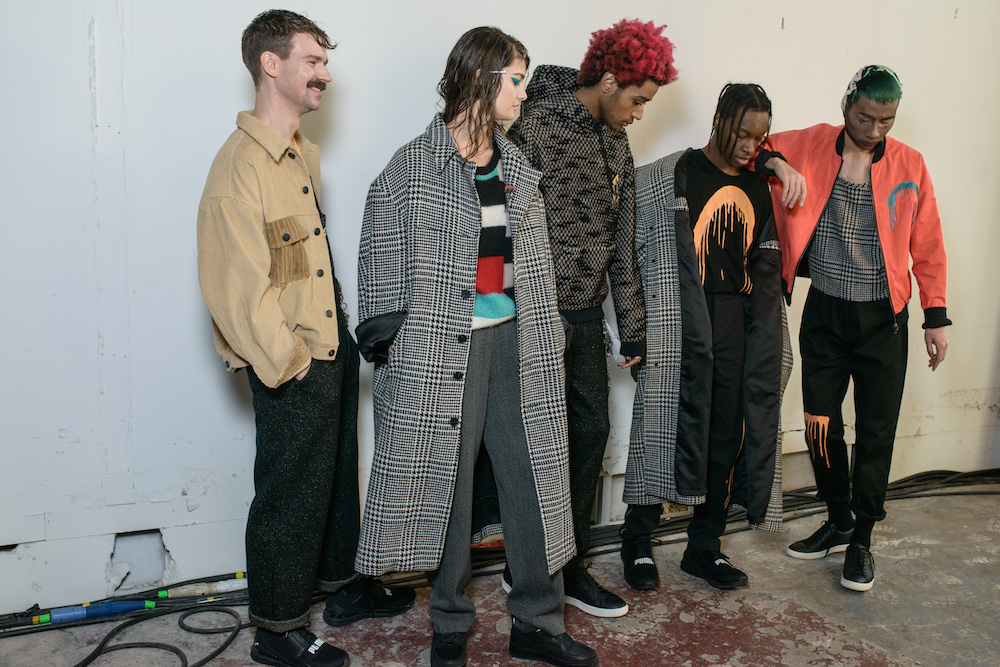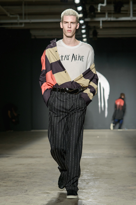 The designers at Rochambeau fused together their own aesthetic with the vision of Mark Mothersbaugh for a successful collaboration. This dialogue culminated with paint dripping on classic menswear silhouettes and faces obscured by masks with a performance alluding to inmates running the asylum. As if the presentation wasn’t enough, making a debut on the runway, fellow CFDA fashion fund competitor Adam Selmen, took to the catwalk in a fall favorite yellow top layered under loose overalls. Other favorites included an asymmetric wide-striped, baggy jumper, houndstooth overcoats, and a gray blazer smeared with a coral goop.