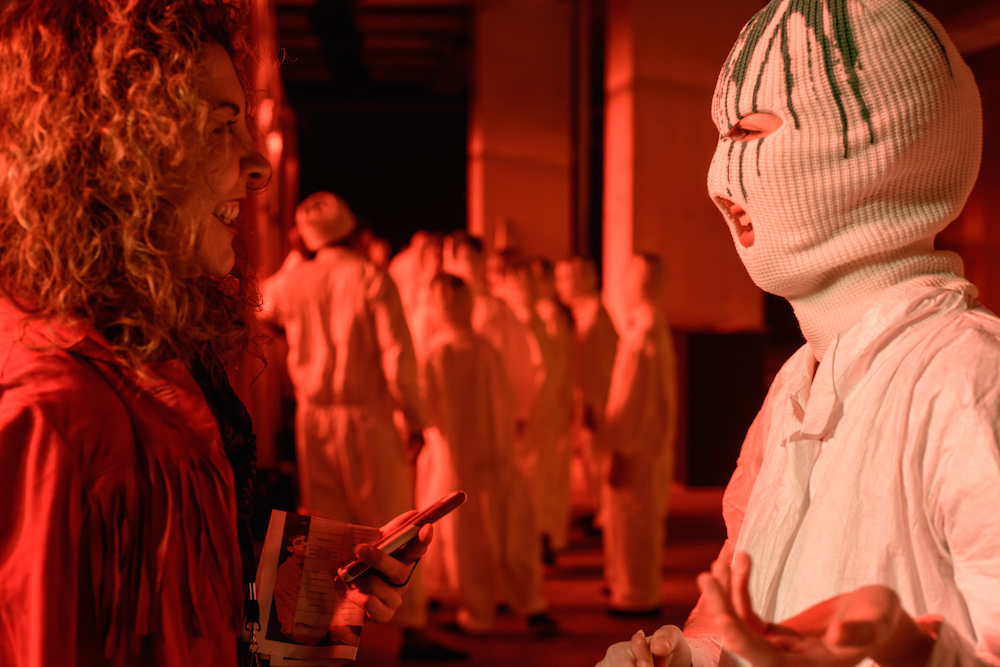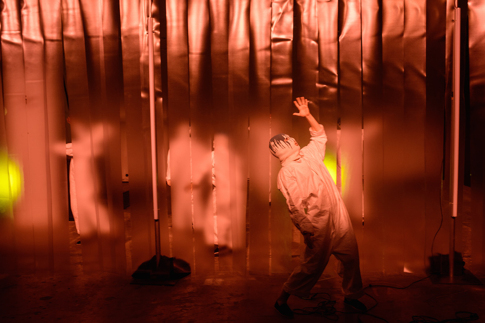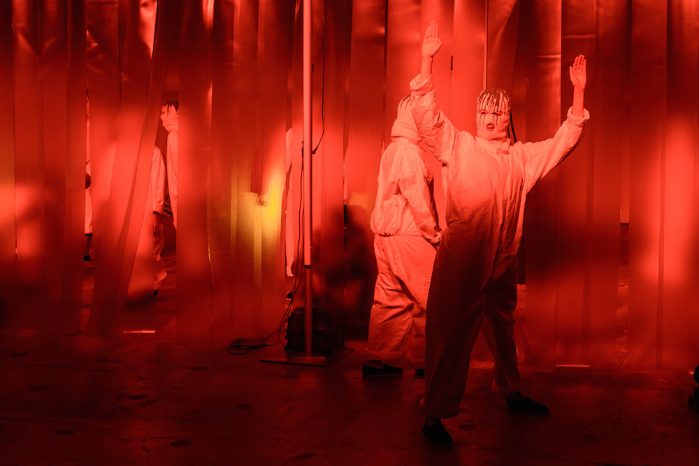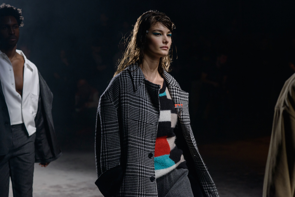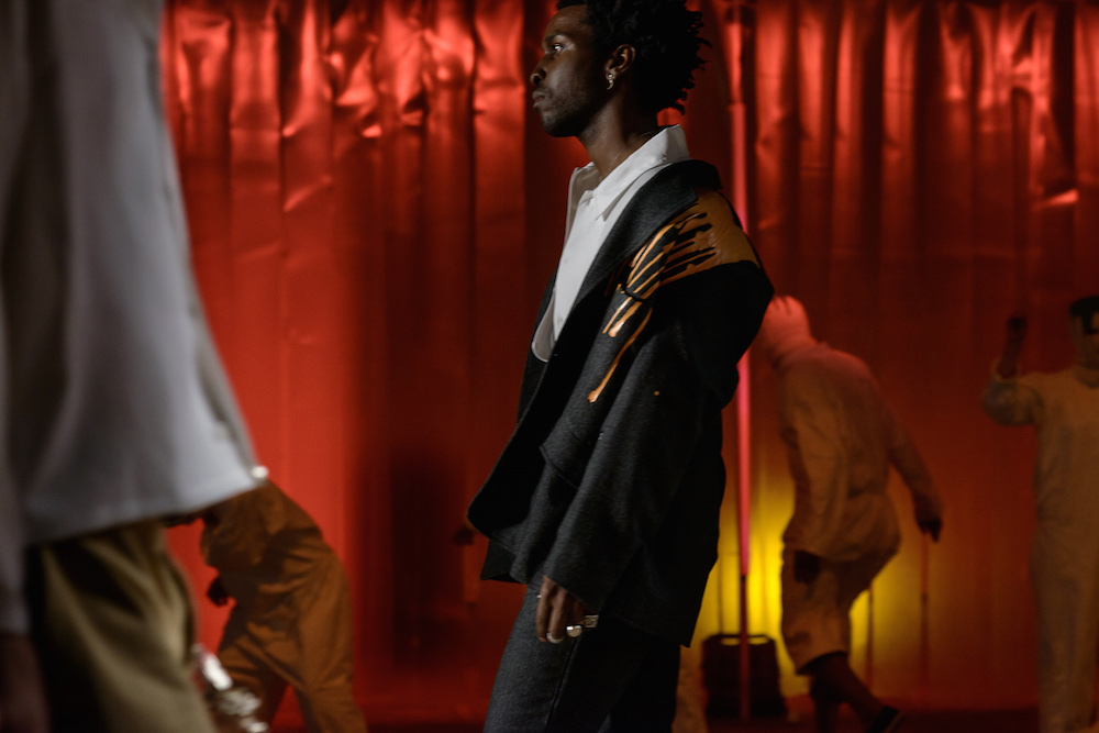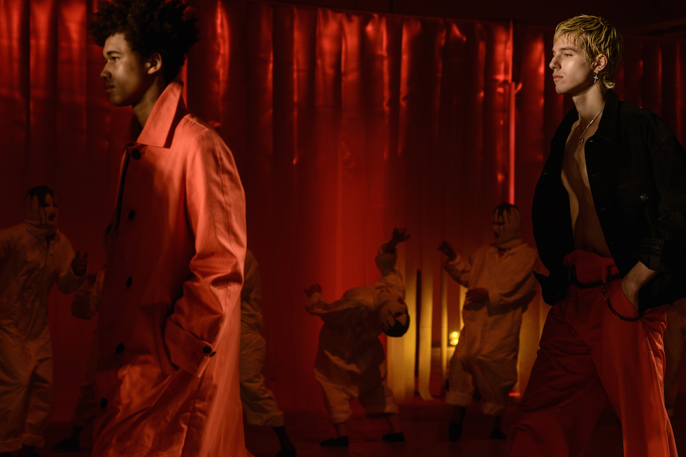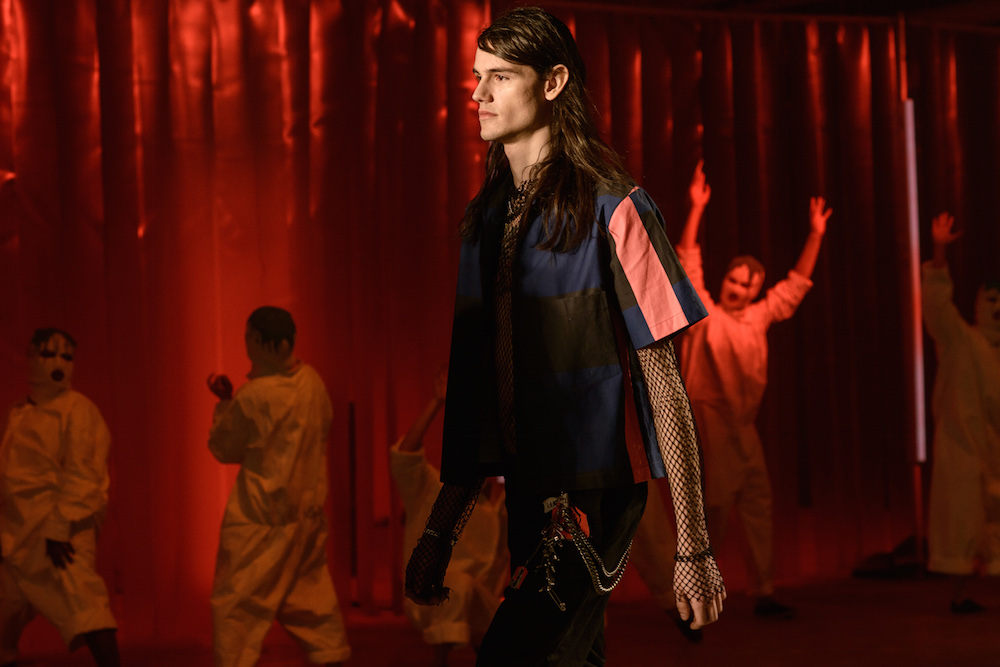 The designers at Rochambeau fused together their own aesthetic with the vision of Mark Mothersbaugh for a successful collaboration. This dialogue culminated with paint dripping on classic menswear silhouettes and faces obscured by masks with a performance alluding to inmates running the asylum. As if the presentation wasn’t enough, making a debut on the runway, fellow CFDA fashion fund competitor Adam Selmen, took to the catwalk in a fall favorite yellow top layered under loose overalls. Other favorites included an asymmetric wide-striped, baggy jumper, houndstooth overcoats, and a gray blazer smeared with a coral goop.