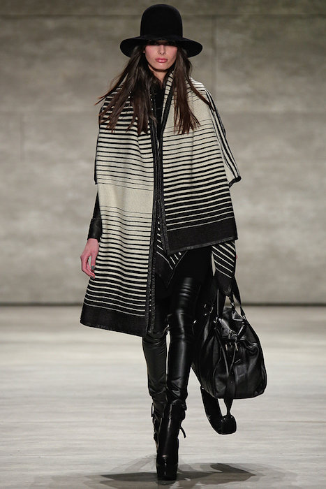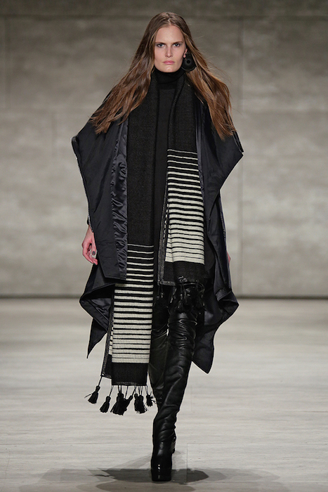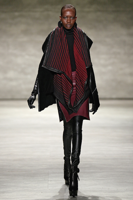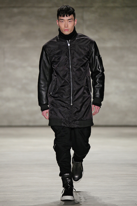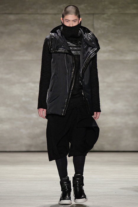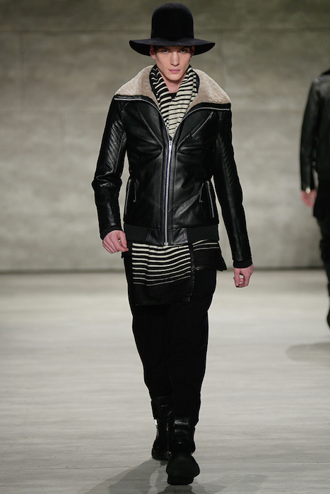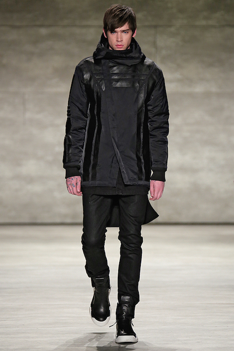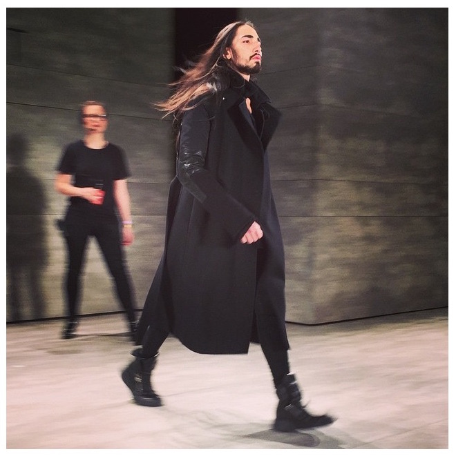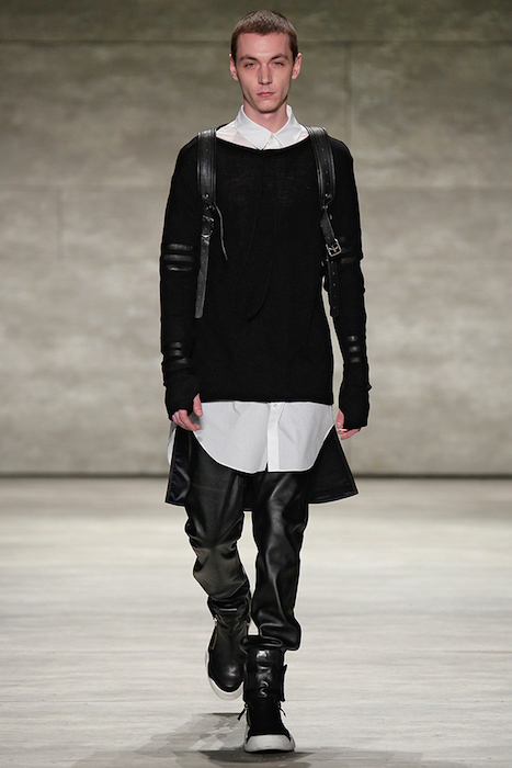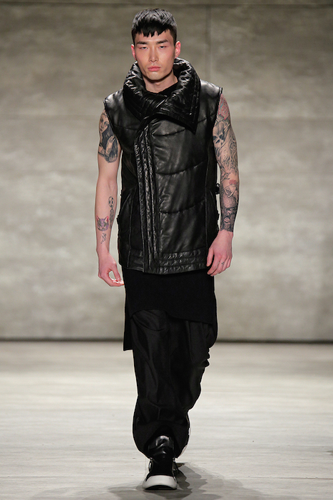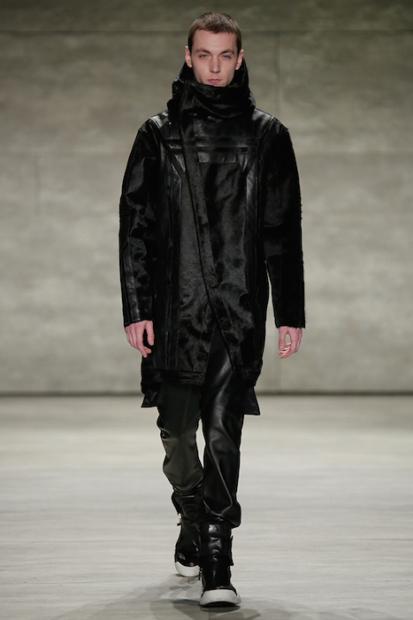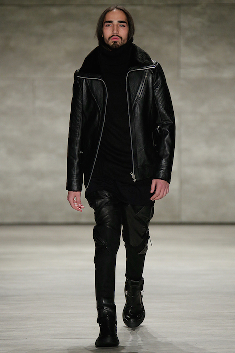 Hot + Layered silhouettes + Leather + Ponchos = Edgy Casual sophistication. Clever yet effortless with a sexy dark appeal, SKINGRAFT fall 2015 gave us some much needed edgy eye candy for fall at NYFW. Black on black jackets with leather and (+fuzzy) forward detailing on the jackets made us feel cozy for the 10 minutes or so at the show. From the likes of Willy Cartier striding on the runway with the long hair to familiars including favorite Willy Cartier, Adonis Bosso, Paul Boche, Cole Mohr, and Yuri Pleskun.