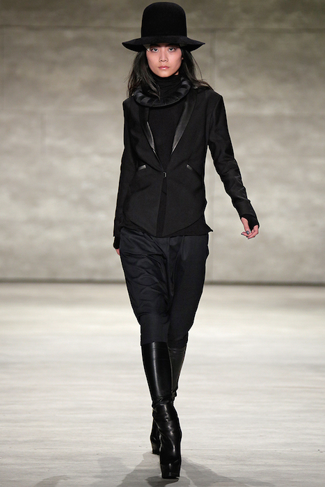 Designer Johnny Cota gave us the range from thigh high black stiletto boots and long black leather gloves to a range of black leather leggings. The menswear looked equally dashing with black leather pants, + high-tops, and cozy patterned wool pieces with designs.