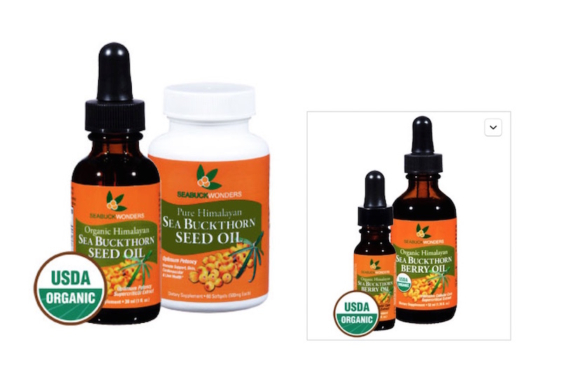 Sea buckthorn seed oil by SEABUCK WONDERS. This unique, Kosher-certified, product is regenerating and provides high content of Omega 3, 6, 9, vitamins A and E, and other nutrients including unsaturated fatty acids and minerals. The organic oil boosts your immune system and improve not only function of the brain and heart but also skin conditions and protection against harmful elements like free radicals. (drop into your juice)