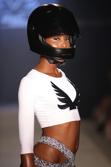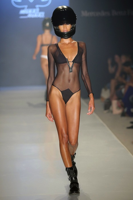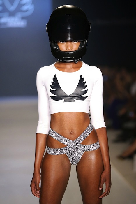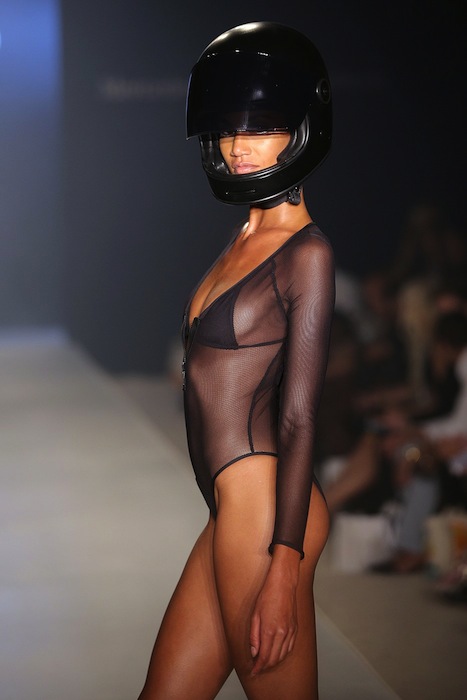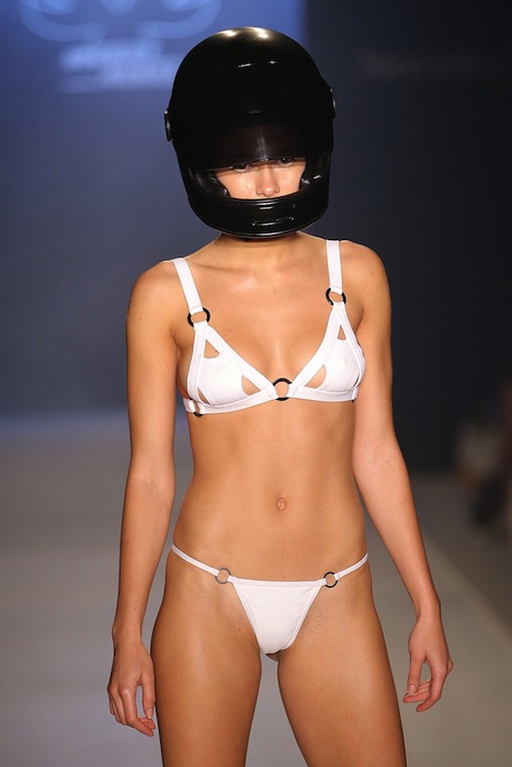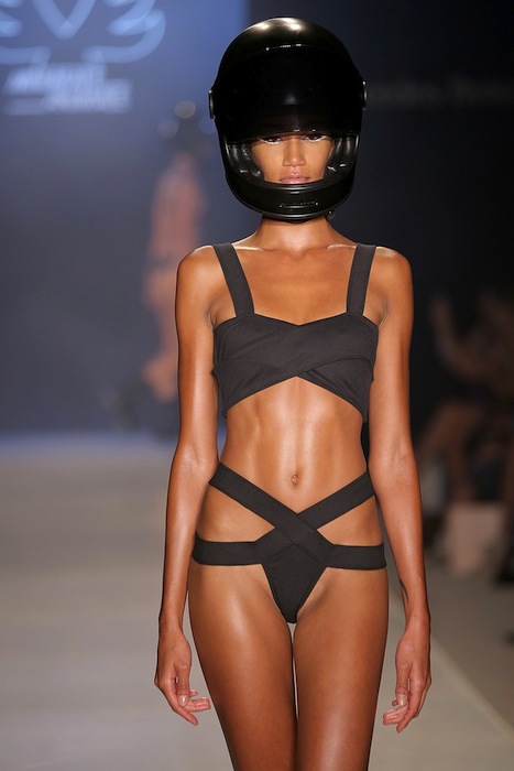 Styled swimwear with an edge. Strapped, edgy, and hot from the MINIMALE ANIMALE summer 2015 MBFW swim runway. Favorites include bikinis, 1 pc wrapped around, and cut out details. No frilly girly or patterned pieces here. The girls strut the catwalk accessorized with helmets.