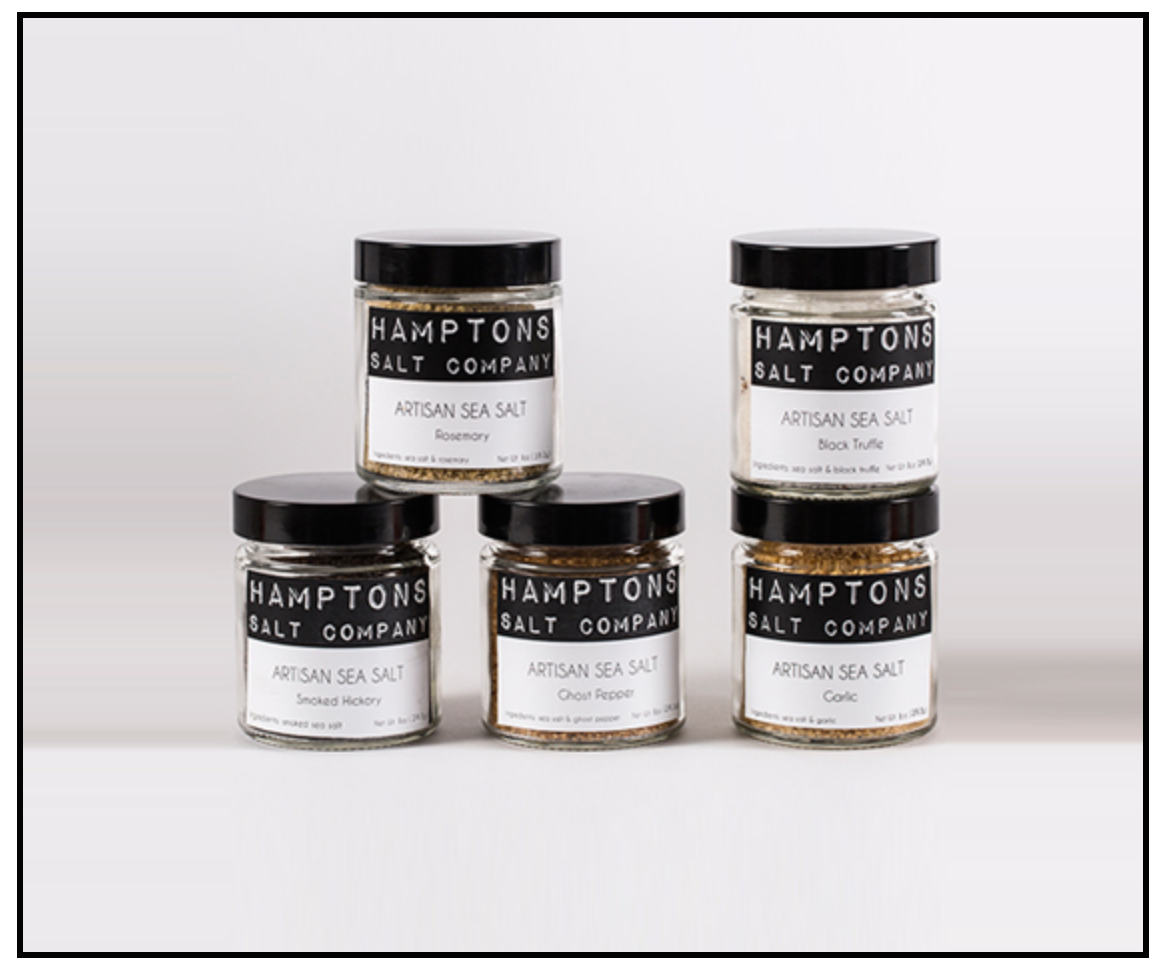 the flavor seeker Hamptons Salt : starter set five mini jars (1 oz.) representing a great cross selection of tastes: Black Truffle, Garlic, Ghost Pepper, Smoked Hickory and Rosemary. In a black gift box.