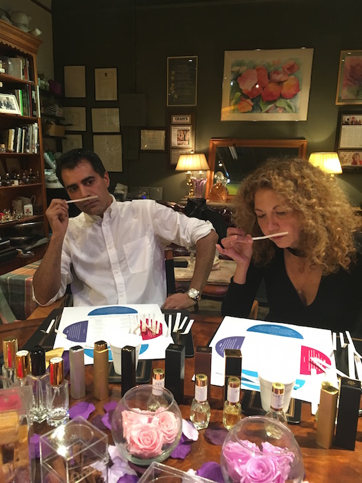 It starts with a certain type of fragrance family, and simply put, Sue chooses a fragrance, and presents a paper stick with it to me: My job was to put the scent I like in 1 pile, the so-so in another, and the out in yet another. What was interesting was both the contrast and the similarities in what I put in faves vs. what my partner put in faves. Did we (me and date now referred to as DU JOUR) love the same flower or woodsy or mossy scent? The question of do we gravitate towards the same kinds of fragrance? or the opposite. I tried to peek over to the right at Du Jour’s selection but was so overwhelmed with my own love pile I was in a confused fragrant state.
