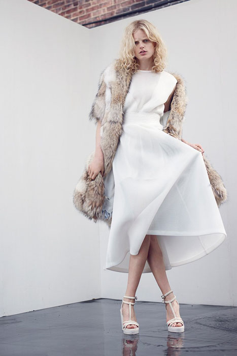 It’s not all dark colors and slim silhouettes either. The old-Hollywood glamour inspired white dress paired with the fur open coat is something out of Marilyn Monroe’s closet. The white suit is also tailored beautifully, while the navy gown is glamorous. Rooney Mara will be snatching that piece up for a red carpet event, no doubt. Mysterious and unique fdmLOVES THEYSKENS THEORY resort 2014 selects by Brigitte Segura, written by Allison Ripa