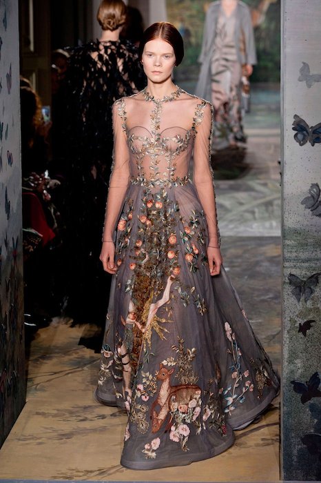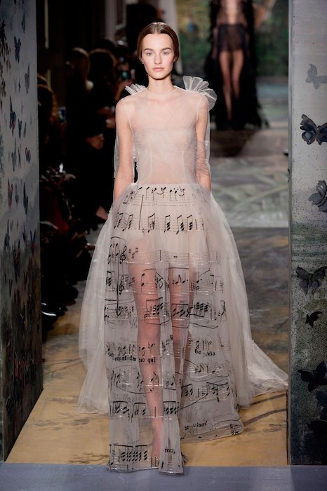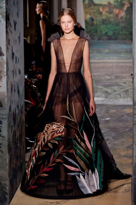 With attractive earth tones that instantly warm the skin, every model including Ondria Hardin in the butterfly number is positively glowing in so many of these gowns. Gorgeous chocolate browns, creams and olives are so inviting. Things are rich like a fine wine. Prints on pieces range from sweet butterflies to the fiercest lions and snakes. We can’t help but feel this is a visual representation of what femininity is. Sugar, spice and everything nice. This collection was commissioned by the Rome Opera House, and this partnership is most evident in the first look, a beautiful sheer gown with printed music notes decorating the skirt. That dress is particularly so charming. Ones with scalloped lace overlays are also stunning.