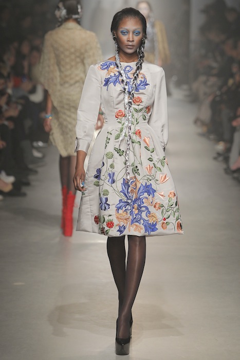 Taken apart, the pieces provide much-needed prints for anyone’s sublime closet. From a white floral-embroidered hourglass dress for day to a burgundy and silver striped v-neck minidress for the nightlife, there are plenty of opportunities to shine. The movement of a leg-baring gold number was our personal fav, while showing that the Westwood woman is no wallflower. The designer updated the centuries-old references by taking the heavy fabrics in golds and deep hues and adding them onto slouchy sweaters and full coats. Fabrics were as rich as they were printed, as brocaded looks were balanced with lighter tulle counterparts (while alluding to the dark whimsy Westwood is known for). Although Westwood’s looks have wearers geared up for battle, the scarlet shoes throughout suggest a more stylish stomping ground come next fall. fdmLOVES Vivienne Westwood Gold Label fall 2013 selects and details by Brigitte Segura. Written by Mary Anderson.