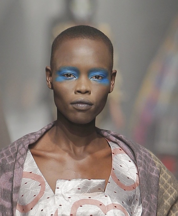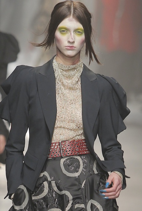 Looking back, but always being aware of the present, the collection also referenced the “Save the Arctic” initiative from Greenpeace. Although the war-painted faces harkened back to the conquerers of the past, they complemented the array of hues that Westwood provided (a shout-out to the brightly-colored manuscripts she referenced). Westwood crossed all silhouette territories, by offering everything from billowing capes to slim trousers, therefore allowing the medieval woman to become modern.