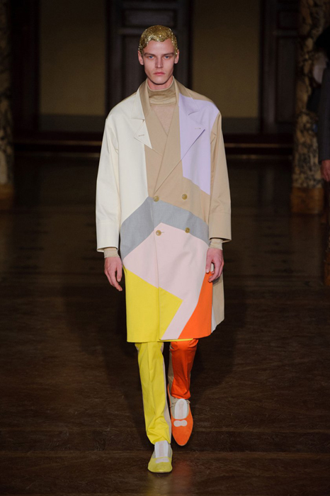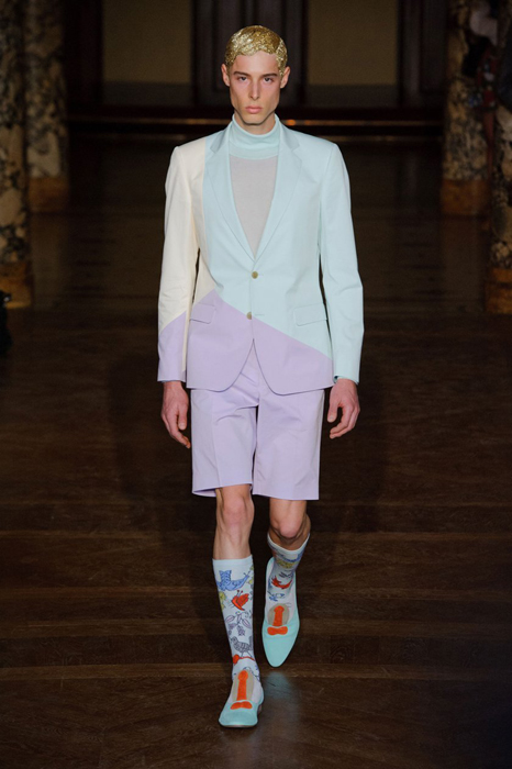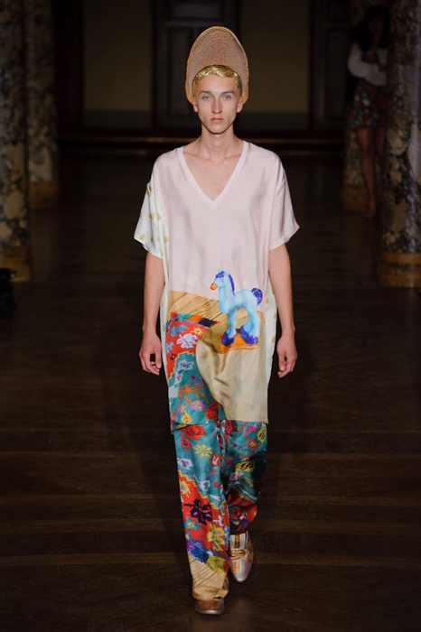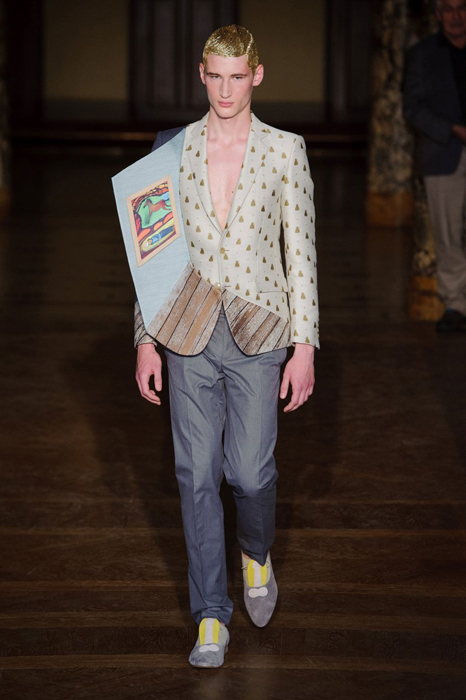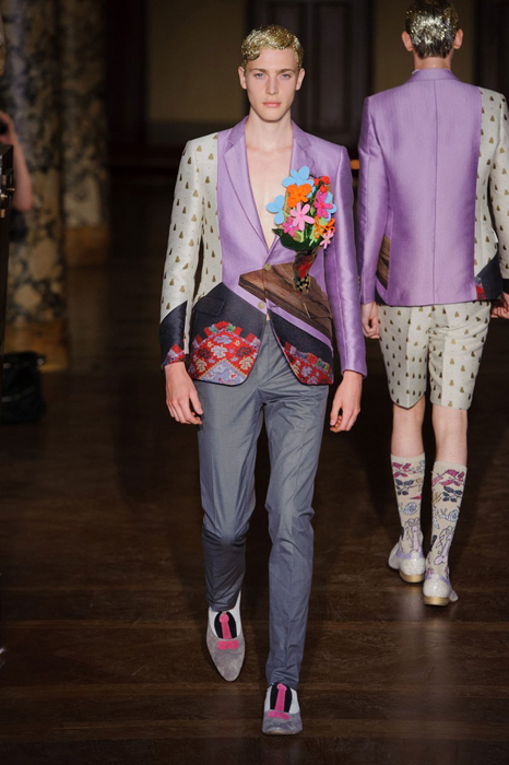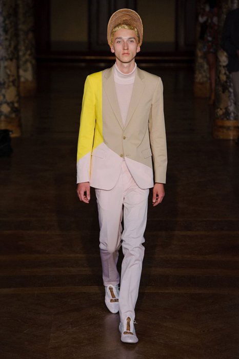 Walter Van Beirendonck is known to have strong themes in all of his collections. His Menswear spring 2014 set is no exception. Titled “Home Sweet Home,” this particular line is based off the Antwerp home he shares with his partner. And when we mean it’s based off home, it literally resembles the inside of his house. Carpet-printed silk pants and tops with flower vases adorn the looks. Milliner Stephen Jones provided the headwear that’s one-of-a-kind. It’s kitchy meets imaginative, never boring.