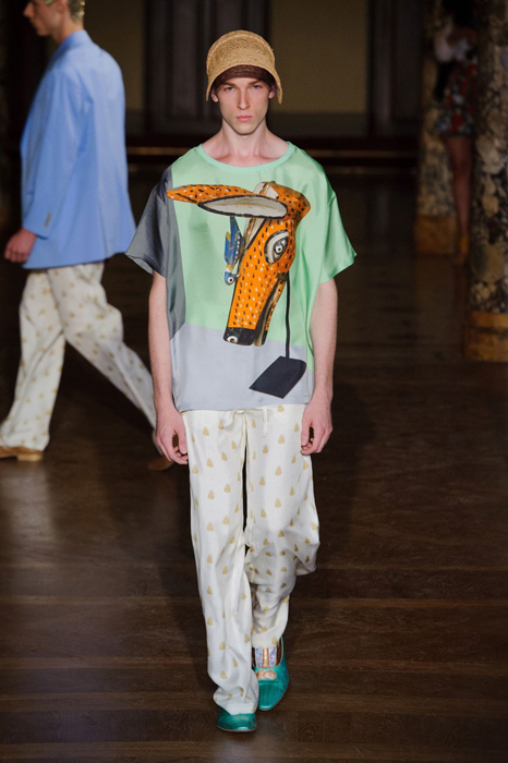 Every piece is like visiting the designer’s home without stepping through the door. High socks are printed with snails and birds and the long bills on raffia caps are attention-grabbing. A master of menswear creations, this designer knows how to entertain his guests. fdmLOVES WALTER VAN BEIRENDONCK Menswear 2014 selects by Brigitte Segura, written by Allison Ripa.