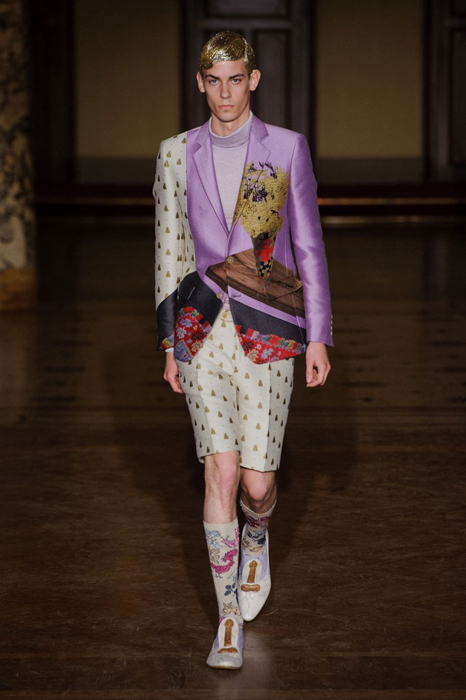 This is one of the most memorable menswear collections so far. Care for a visit? Color blocking and mixed print suits are wild. One in particular shows a vase of yellow flowers delicately placed on a wooden table. The triangle-print shorts look like the wallpaper these flowers would be in front of. The same print is embellished on another blazer, this time embroidered to create a dazzling 3D effect. The flowers look like they can be taken from the model’s breast pocket. A navy and white ensemble reached a level of ferocity with snakeskin gloves that spanned up the arms…like a high-class plumber ready for work. Things still remain avant-garde throughout with elongated coats and large boxy shoulders. It’s 1980s silhouettes with 21st century modernity.