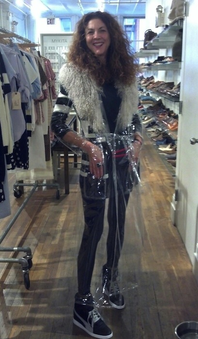 photo 2: brigitte segura wearing Puma Wedges with Alice Roi raincoat.