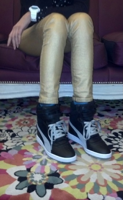 photo 1: brigitte segura wearing Puma wedges, gold kancan jeans, and g-shock watch.