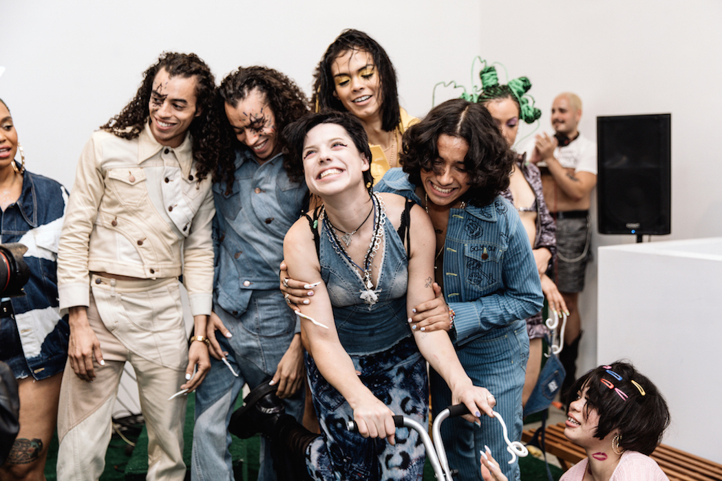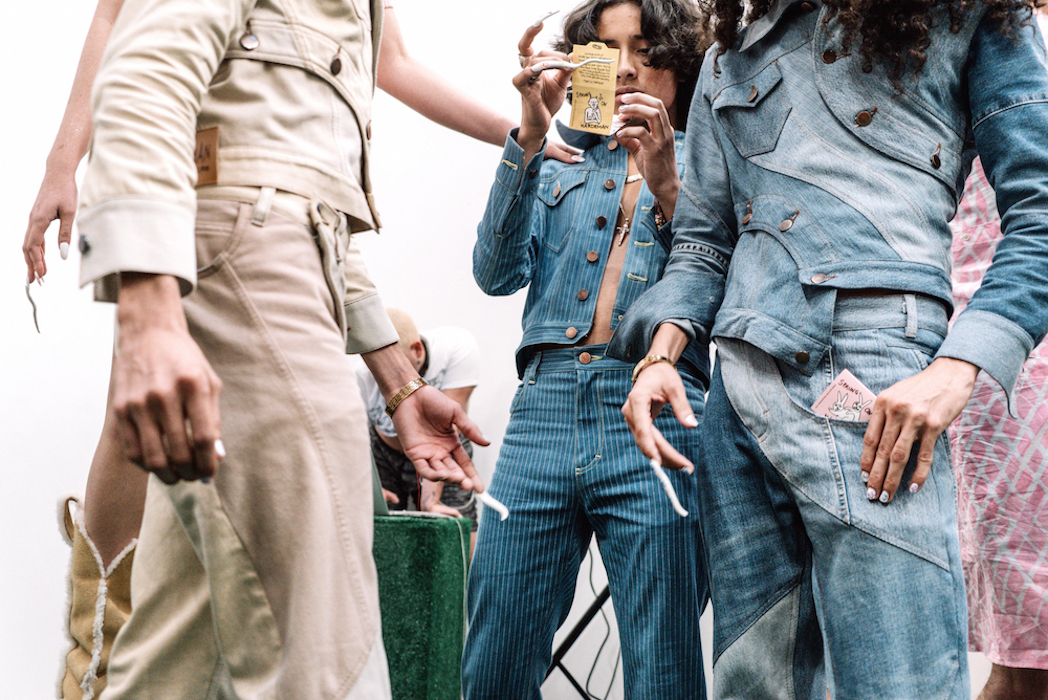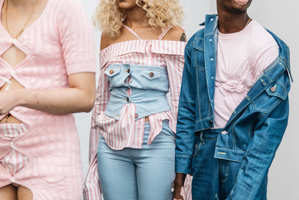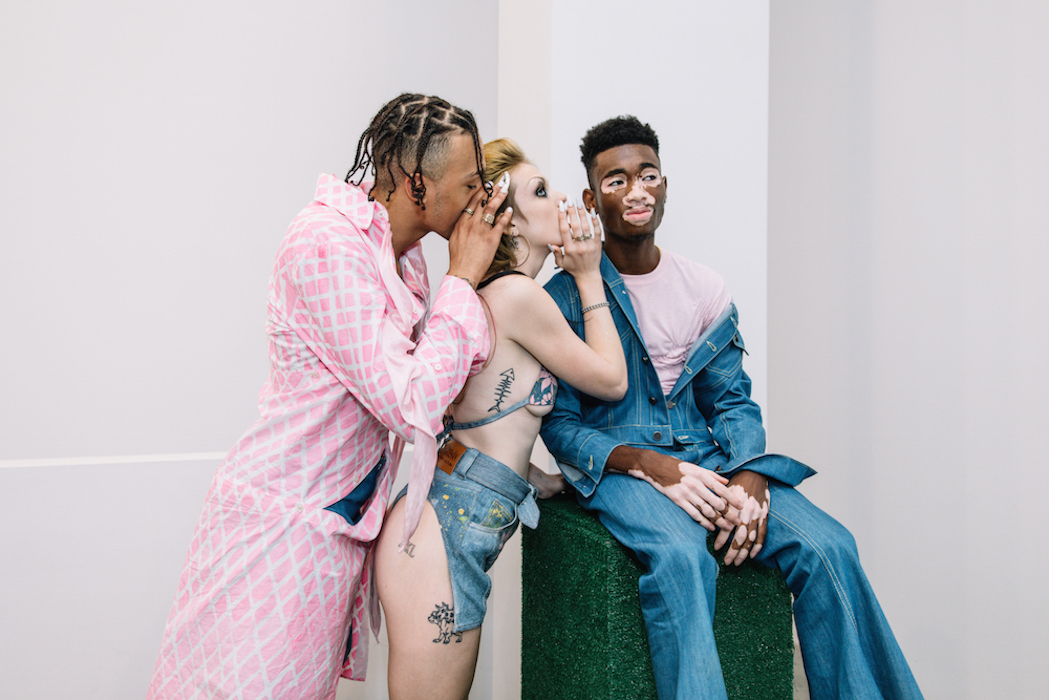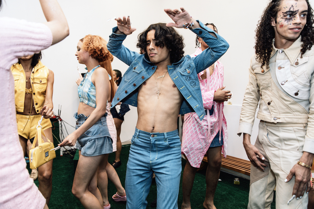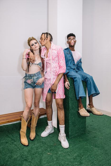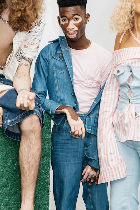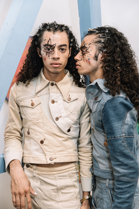 YOUNG + FABULOUS creators HARDEMAN blast us with a beat of hip for spring 2019 during NYFW. Sweet like candy streetwear vibes with a pop of 70’s. Behind the scenes vibes take you from the 70’s show to a pink striped fest. Wild hair + curls on view with the Bailey twins all with dolled up faces with messages. DENIM gone happy; fun is the new fashion.
