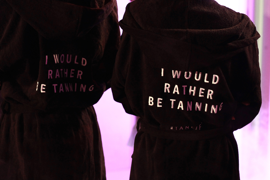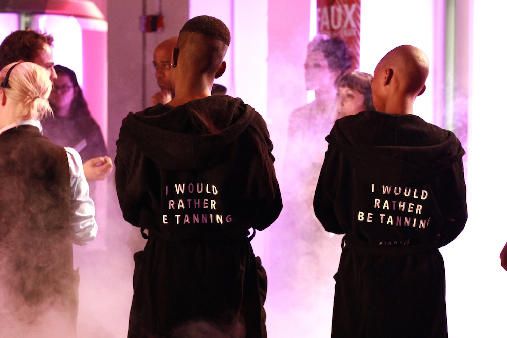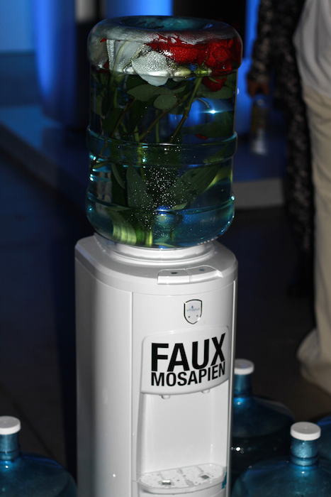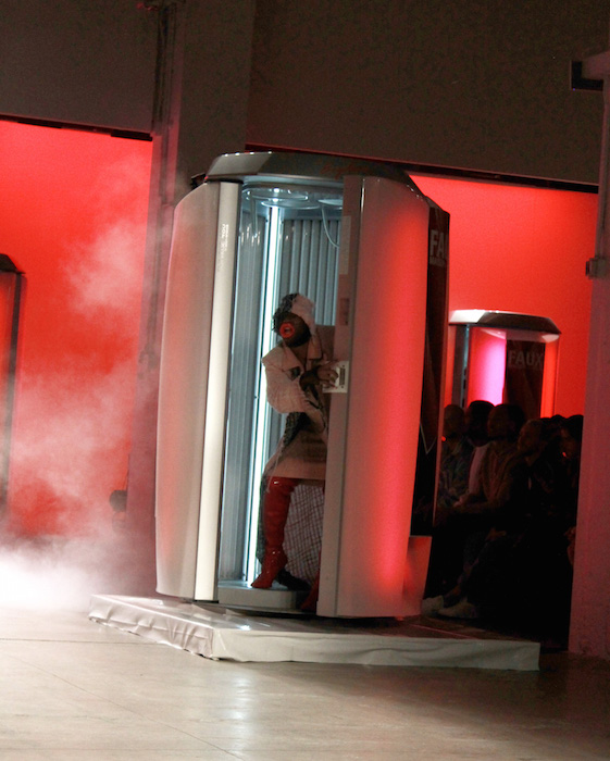 The FAUXmosapien filled world from the Dutch fictional land were baptised from a water dispenser, christening them as “FAUXmosapiens”, before entering vertical, incubator-like tanning beds.