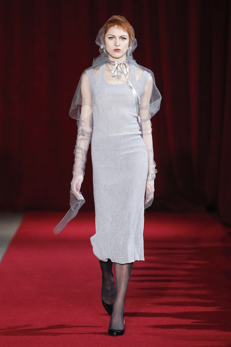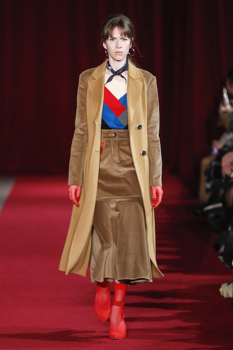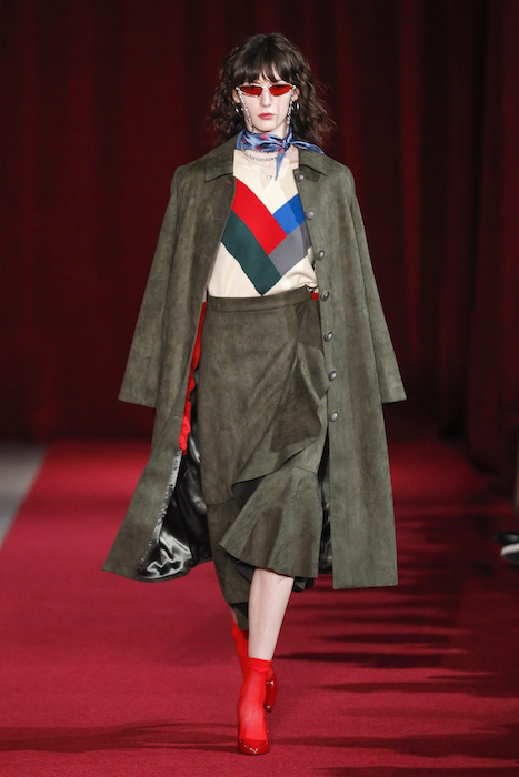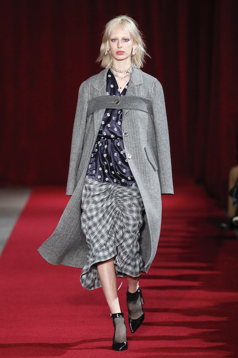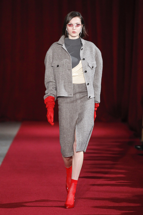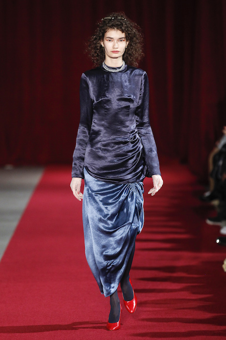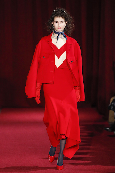 The show held at The Whitney Museum during NYFW, designed by architect Renzo Piano, offers a minimalistic set for Luo’s warm collection. The glass space, fully dressed in warm burgundy, draws parallels with Marden’s monochrome paintings, featured in the museum’s permanent collection.