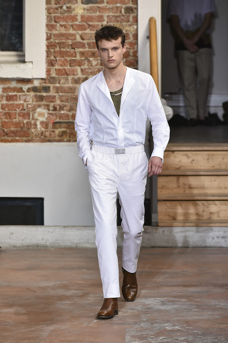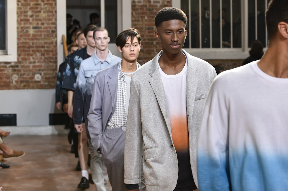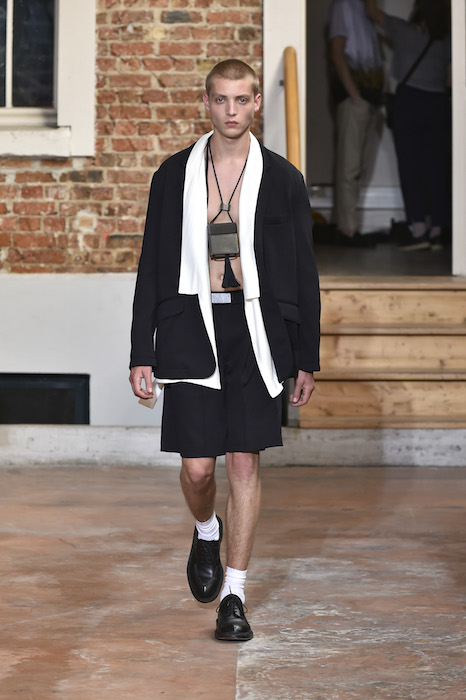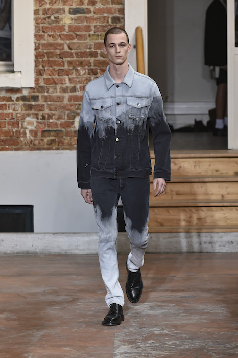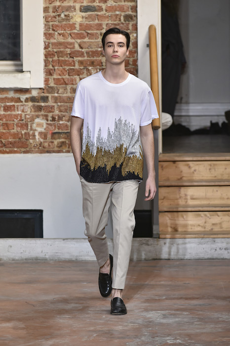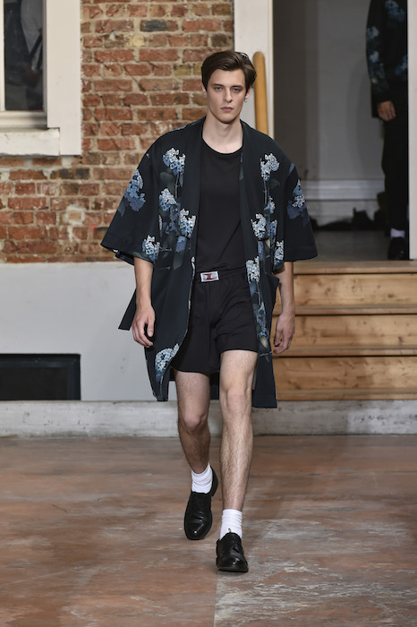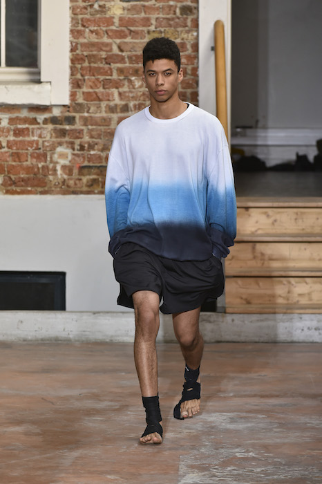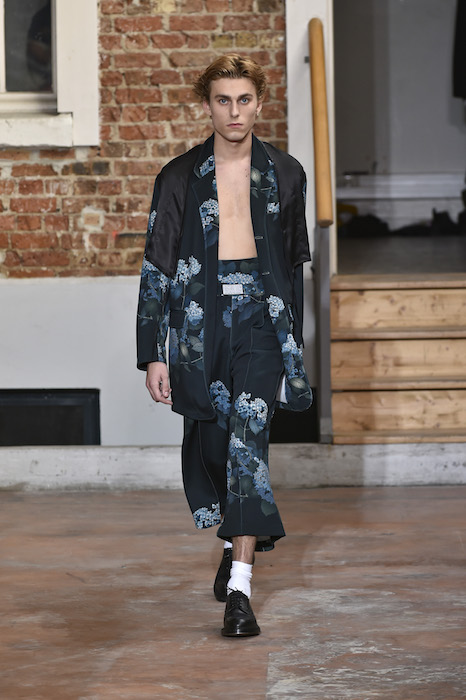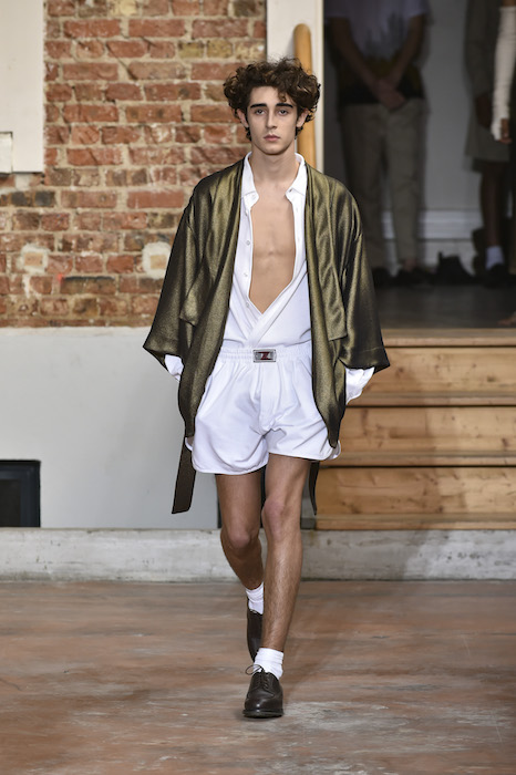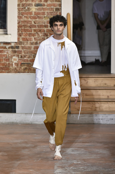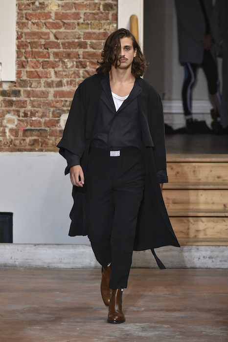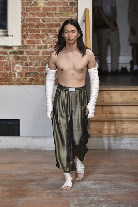 YOUNG + FRESH: Introducing Louis Gabriel Nouchi menswear on the Paris runway. The SS19 collection, inspired by Yukio Mishima’s book “The Temple of The Golden Pavilion”, reflects on the notion of beauty in a world in crisis. Loose cuts reminiscent of kimonos in silks are fused with overdyed and bleached jersey and denim.