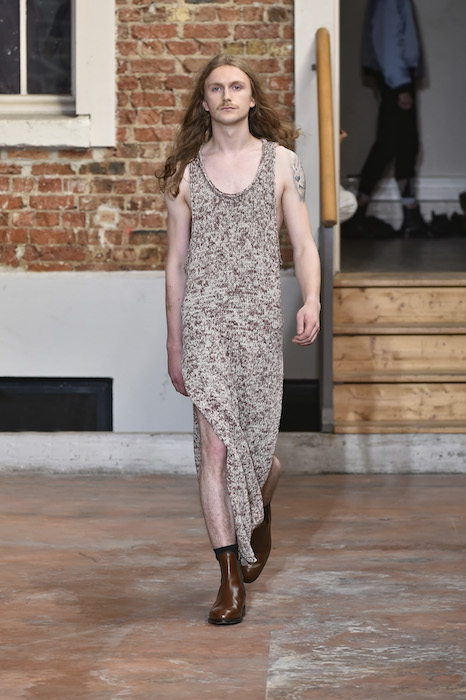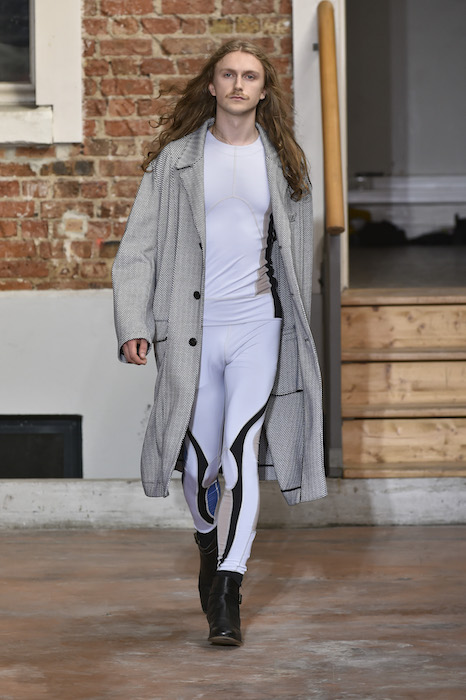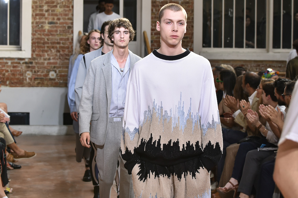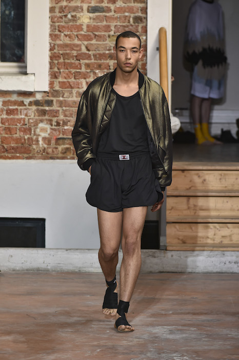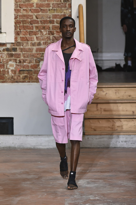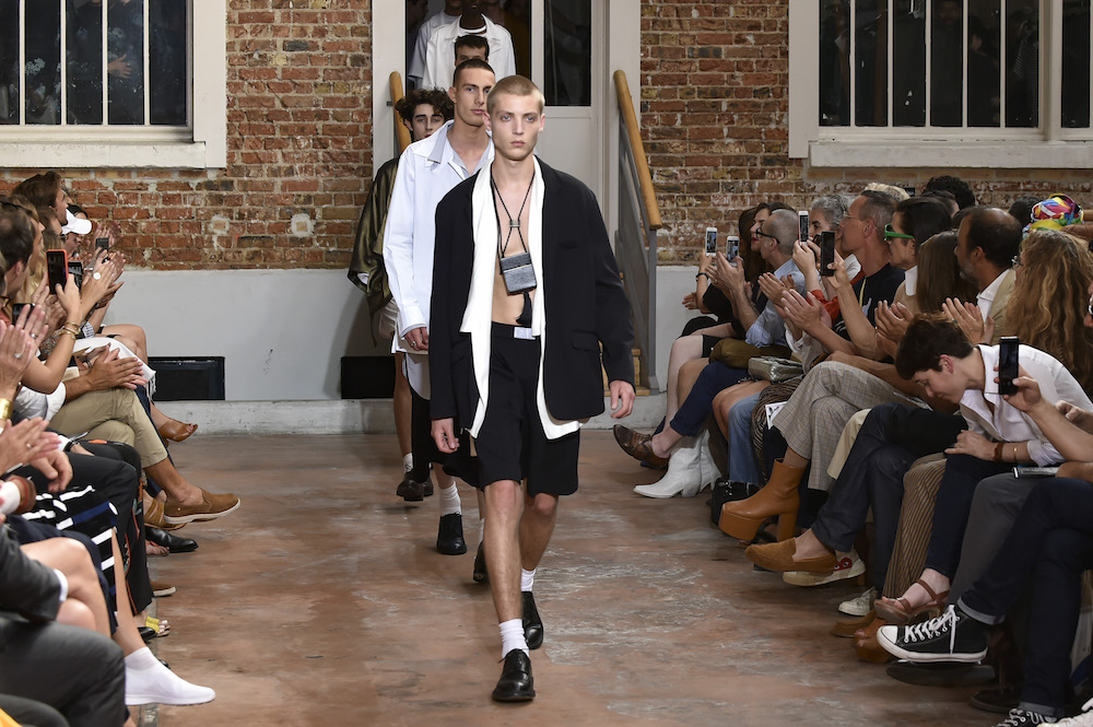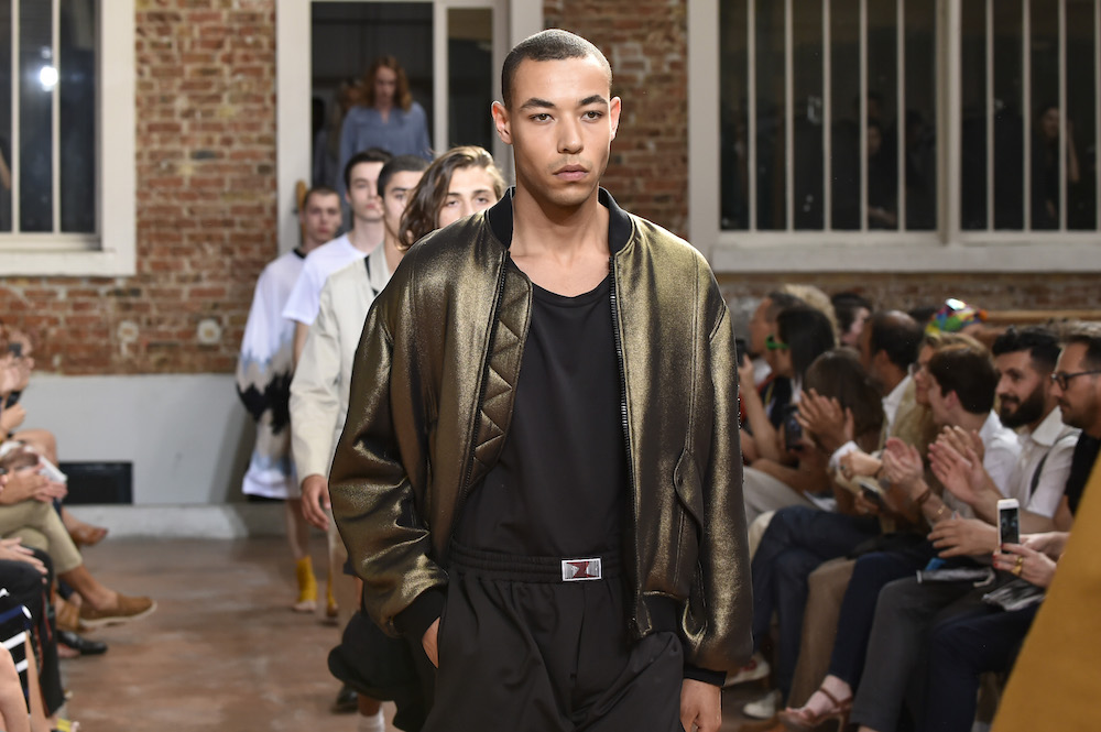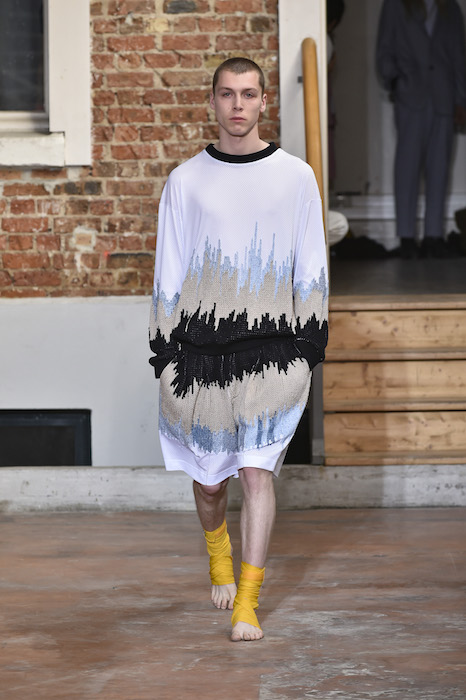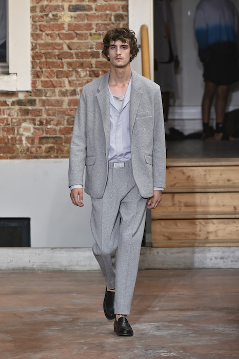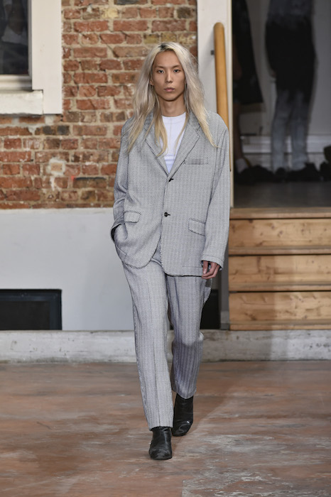 YOUNG + FRESH: Introducing Louis Gabriel Nouchi menswear on the Paris runway. The SS19 collection, inspired by Yukio Mishima’s book “The Temple of The Golden Pavilion”, reflects on the notion of beauty in a world in crisis. Loose cuts reminiscent of kimonos in silks are fused with overdyed and bleached jersey and denim.